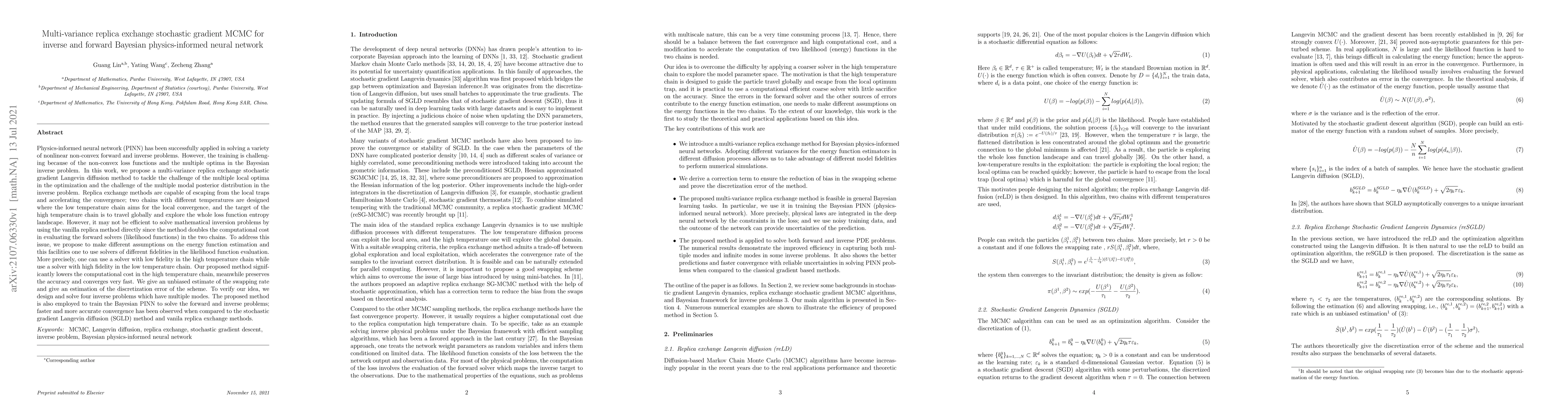 Physics-informed neural network (PINN) has been successfully applied in solving a variety of nonlinear non-convex forward and inverse problems. However, the training is challenging because of the non-convex loss functions and the multiple optima in the Bayesian inverse problem. In this work, we propose a multi-variance replica exchange stochastic gradient Langevin diffusion method to tackle the challenge of the multiple local optima in the optimization and the challenge of the multiple modal posterior distribution in the inverse problem. Replica exchange methods are capable of escaping from the local traps and accelerating the convergence. However, it may not be efficient to solve mathematical inversion problems by using the vanilla replica method directly since the method doubles the computational cost in evaluating the forward solvers (likelihood functions) in the two chains. To address this issue, we propose to make different assumptions on the energy function estimation and this facilities one to use solvers of different fidelities in the likelihood function evaluation. We give an unbiased estimate of the swapping rate and give an estimation of the discretization error of the scheme. To verify our idea, we design and solve four inverse problems which have multiple modes. The proposed method is also employed to train the Bayesian PINN to solve the forward and inverse problems; faster and more accurate convergence has been observed when compared to the stochastic gradient Langevin diffusion (SGLD) method and vanila replica exchange methods.