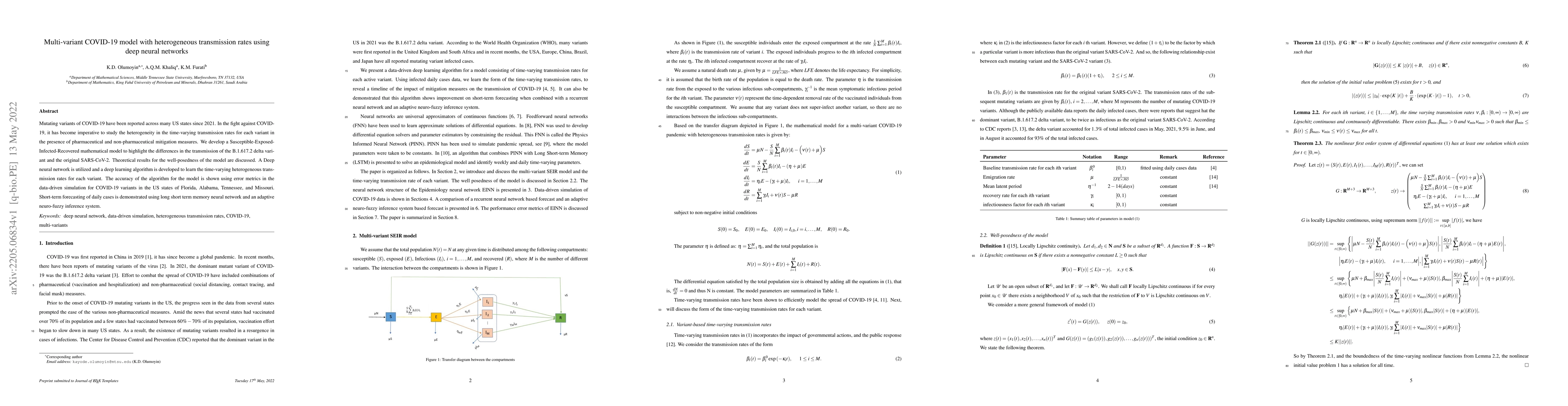 Mutating variants of COVID-19 have been reported across many US states since 2021. In the fight against COVID-19, it has become imperative to study the heterogeneity in the time-varying transmission rates for each variant in the presence of pharmaceutical and non-pharmaceutical mitigation measures. We develop a Susceptible-Exposed-Infected-Recovered mathematical model to highlight the differences in the transmission of the B.1.617.2 delta variant and the original SARS-CoV-2. Theoretical results for the well-posedness of the model are discussed. A Deep neural network is utilized and a deep learning algorithm is developed to learn the time-varying heterogeneous transmission rates for each variant. The accuracy of the algorithm for the model is shown using error metrics in the data-driven simulation for COVID-19 variants in the US states of Florida, Alabama, Tennessee, and Missouri. Short-term forecasting of daily cases is demonstrated using long short term memory neural network and an adaptive neuro-fuzzy inference system.