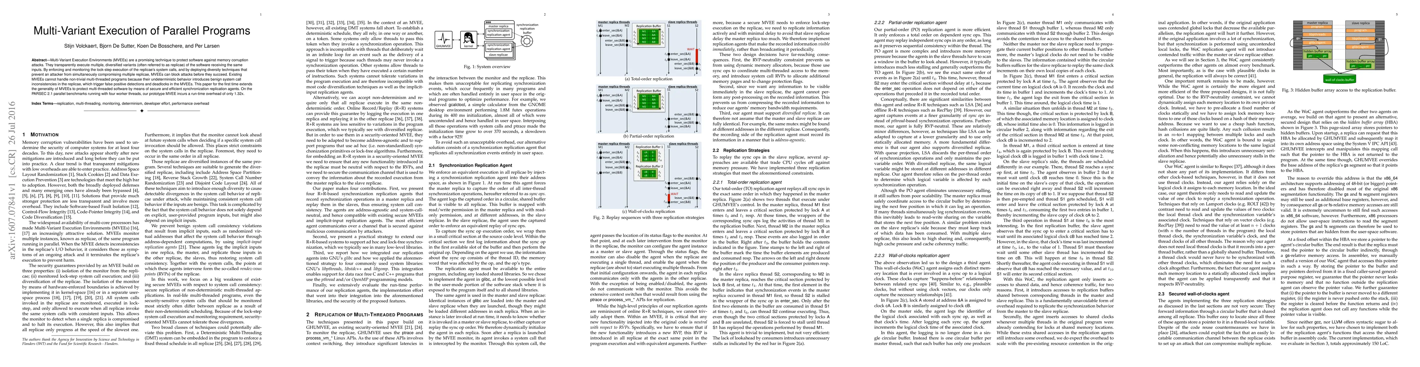 Multi-Variant Execution Environments (MVEEs) are a promising technique to protect software against memory corruption attacks. They transparently execute multiple, diversified variants (often referred to as replicae) of the software receiving the same inputs. By enforcing and monitoring the lock-step execution of the replicae's system calls, and by deploying diversity techniques that prevent an attacker from simultaneously compromising multiple replicae, MVEEs can block attacks before they succeed. Existing MVEEs cannot handle non-trivial multi-threaded programs because their undeterministic behavior introduces benign system call inconsistencies in the replicae, which trigger false positive detections and deadlocks in the MVEEs. This paper for the first time extends the generality of MVEEs to protect multi-threaded software by means of secure and efficient synchronization replication agents. On the PARSEC 2.1 parallel benchmarks running with four worker threads, our prototype MVEE incurs a run-time overhead of only 1.32x.