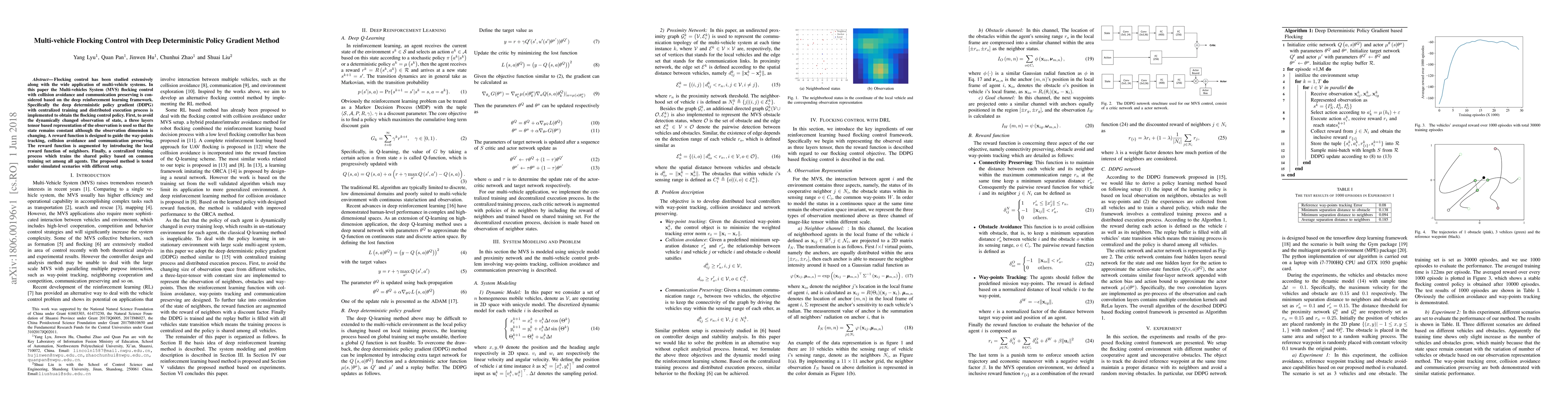 This paper proposes a deep deterministic policy gradient (DDPG) method for multi-vehicle flocking control, ensuring collision avoidance and communication preservation. The DDPG framework employs a centralized training with distributed execution, using a three-layer tensor representation to maintain constant state despite changing observation dimensions.