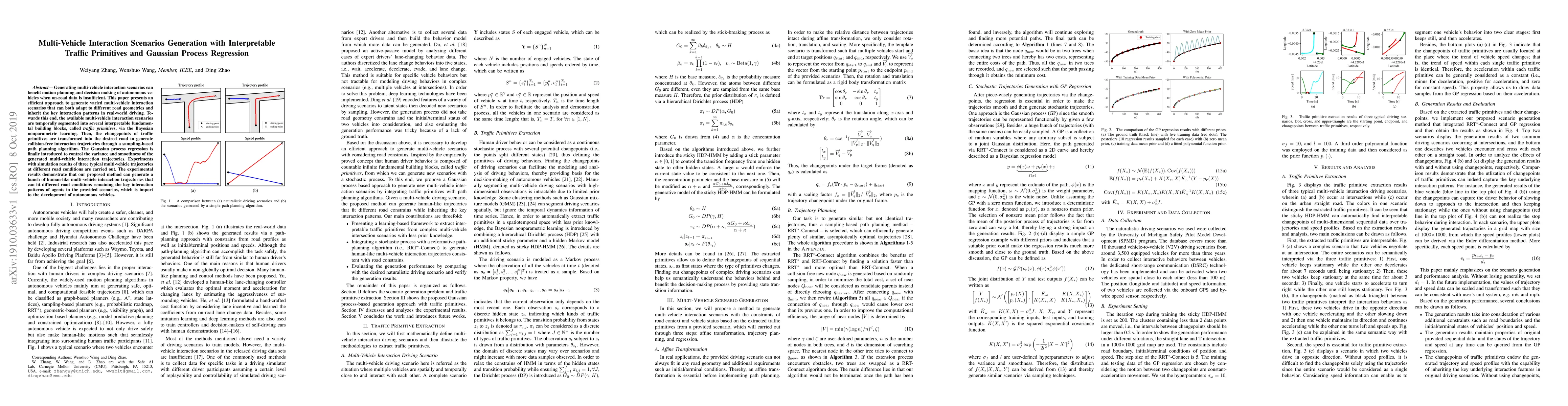 This paper proposes a method to generate varied multi-vehicle interaction scenarios using interpretable traffic primitives and Gaussian process regression. The approach segments real-world driving patterns into fundamental building blocks, then adapts them to different road geometries to create collision-free trajectories for autonomous vehicle motion planning.