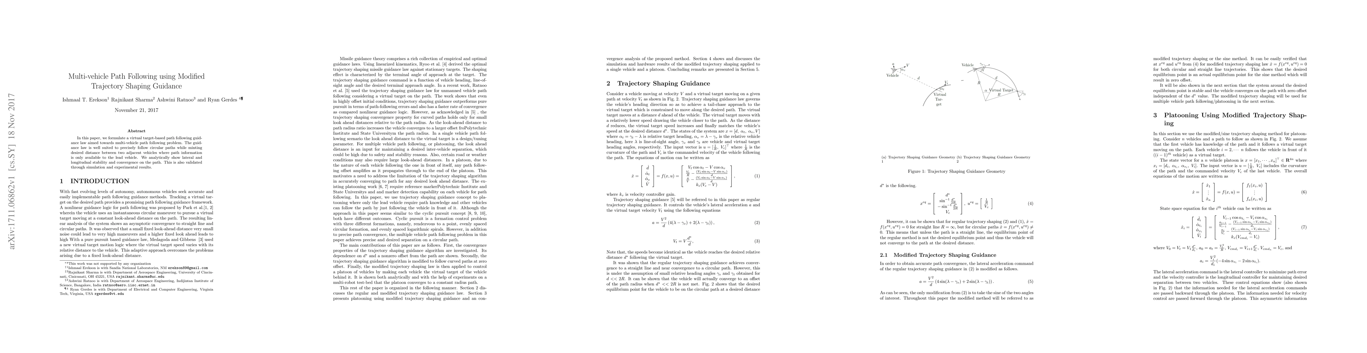 The paper presents a modified trajectory shaping guidance law that ensures multi-vehicle path following stability and convergence, independent of the desired spacing (d∗) between vehicles.
