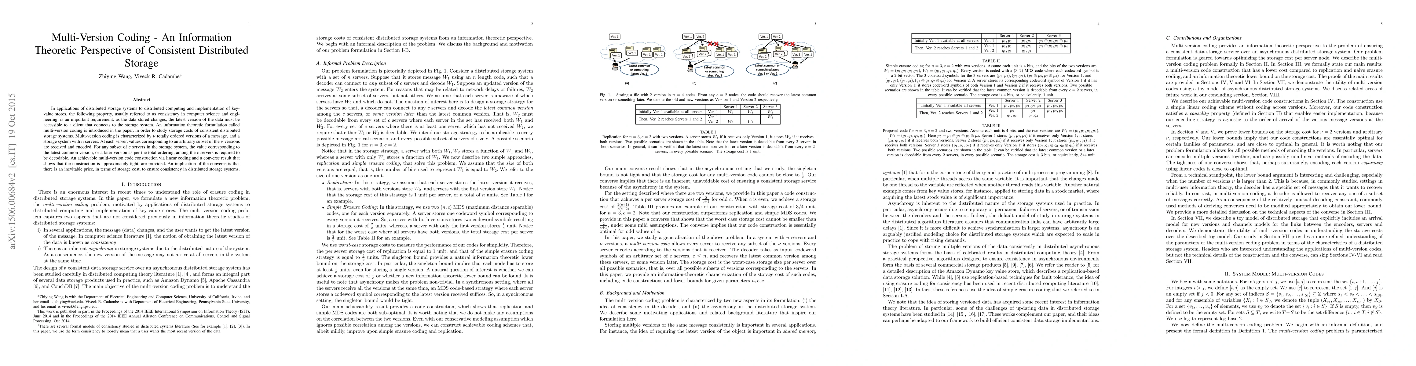 This paper introduces multi-version coding from an information-theoretic perspective to analyze the storage costs of consistent distributed storage systems. It presents a construction method using linear coding and proves its near-optimality, highlighting the inherent trade-off between consistency and storage efficiency.