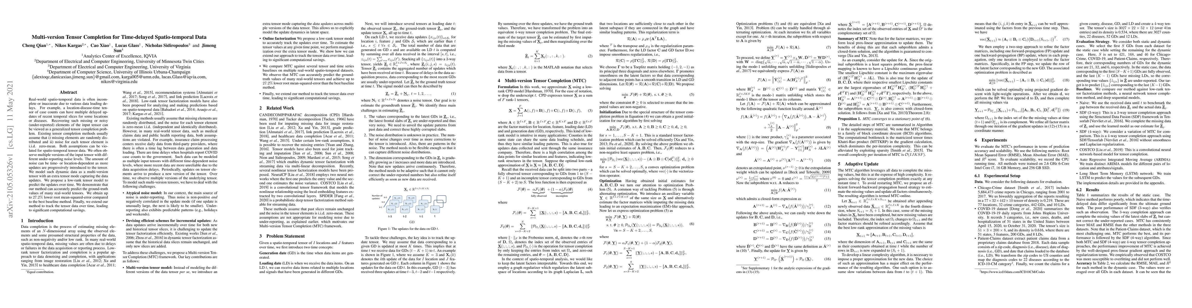This paper proposes a multi-version tensor completion method to handle time-delayed spatio-temporal data, addressing the limitations of existing methods that assume random missingness and independent noise. The method accurately predicts missing values and achieves up to 27.2% lower error compared to baselines, while also enabling efficient tracking over time.