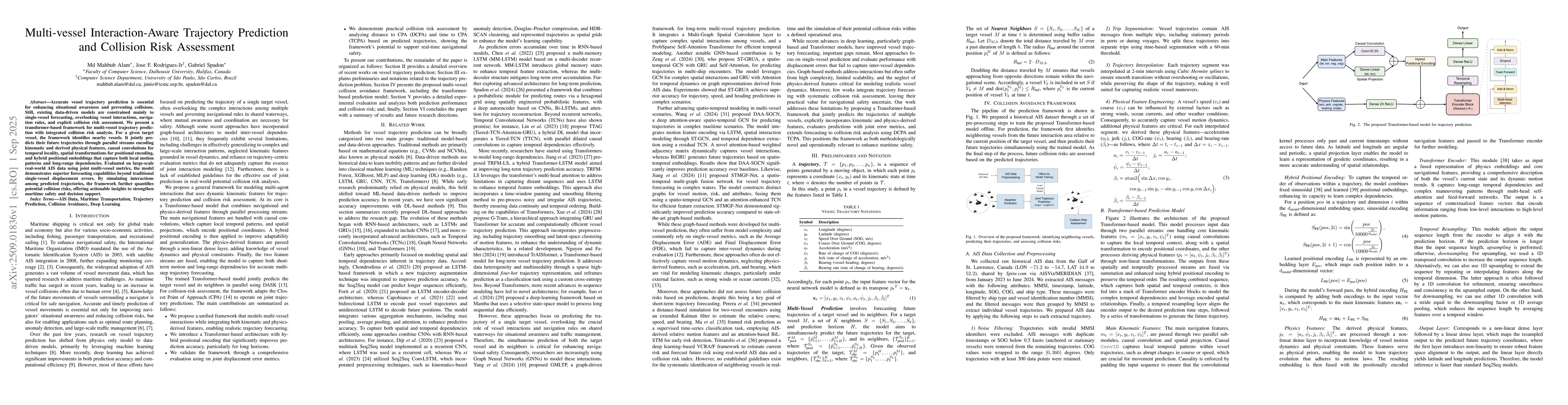 Accurate vessel trajectory prediction is essential for enhancing situational awareness and preventing collisions. Still, existing data-driven models are constrained mainly to single-vessel forecasting, overlooking vessel interactions, navigation rules, and explicit collision risk assessment. We present a transformer-based framework for multi-vessel trajectory prediction with integrated collision risk analysis. For a given target vessel, the framework identifies nearby vessels. It jointly predicts their future trajectories through parallel streams encoding kinematic and derived physical features, causal convolutions for temporal locality, spatial transformations for positional encoding, and hybrid positional embeddings that capture both local motion patterns and long-range dependencies. Evaluated on large-scale real-world AIS data using joint multi-vessel metrics, the model demonstrates superior forecasting capabilities beyond traditional single-vessel displacement errors. By simulating interactions among predicted trajectories, the framework further quantifies potential collision risks, offering actionable insights to strengthen maritime safety and decision support.