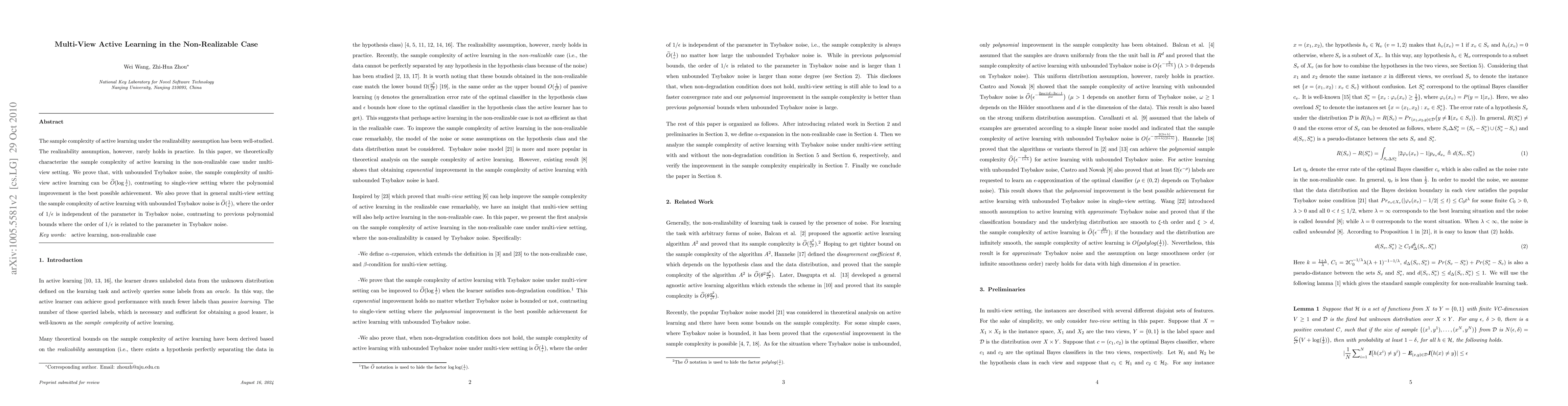 The sample complexity of active learning under the realizability assumption has been well-studied. The realizability assumption, however, rarely holds in practice. In this paper, we theoretically characterize the sample complexity of active learning in the non-realizable case under multi-view setting. We prove that, with unbounded Tsybakov noise, the sample complexity of multi-view active learning can be $\widetilde{O}(\log\frac{1}{\epsilon})$, contrasting to single-view setting where the polynomial improvement is the best possible achievement. We also prove that in general multi-view setting the sample complexity of active learning with unbounded Tsybakov noise is $\widetilde{O}(\frac{1}{\epsilon})$, where the order of $1/\epsilon$ is independent of the parameter in Tsybakov noise, contrasting to previous polynomial bounds where the order of $1/\epsilon$ is related to the parameter in Tsybakov noise.