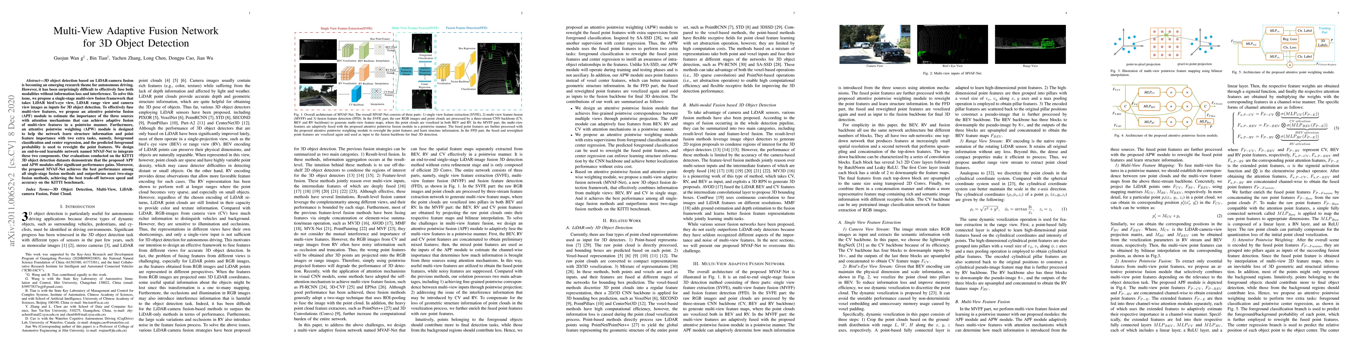 The paper proposes MVAF-Net, a single-stage multi-view fusion framework for 3D object detection using LiDAR and camera inputs. It employs an attentive pointwise fusion module and an attentive pointwise weighting module to adaptively fuse multi-view features, achieving superior performance on the KITTI dataset compared to both single-stage and two-stage fusion methods.