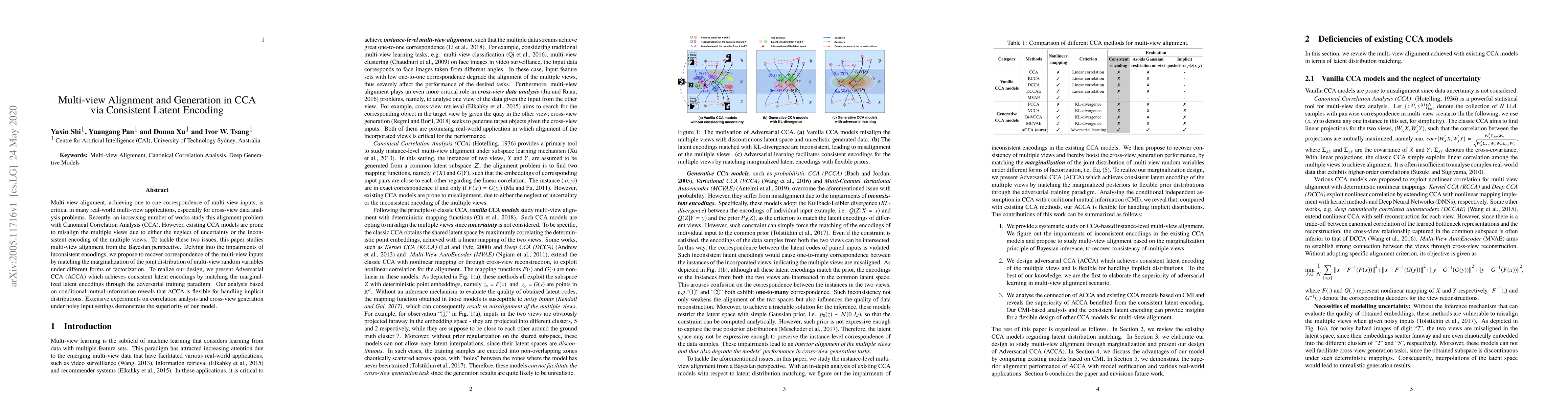 This paper proposes Adversarial CCA (ACCA) to address multi-view alignment issues in Canonical Correlation Analysis (CCA) by ensuring consistent latent encodings through adversarial training. The model matches marginalized latent encodings to handle implicit distributions, demonstrating superior performance in correlation analysis and cross-view generation under noisy conditions.
