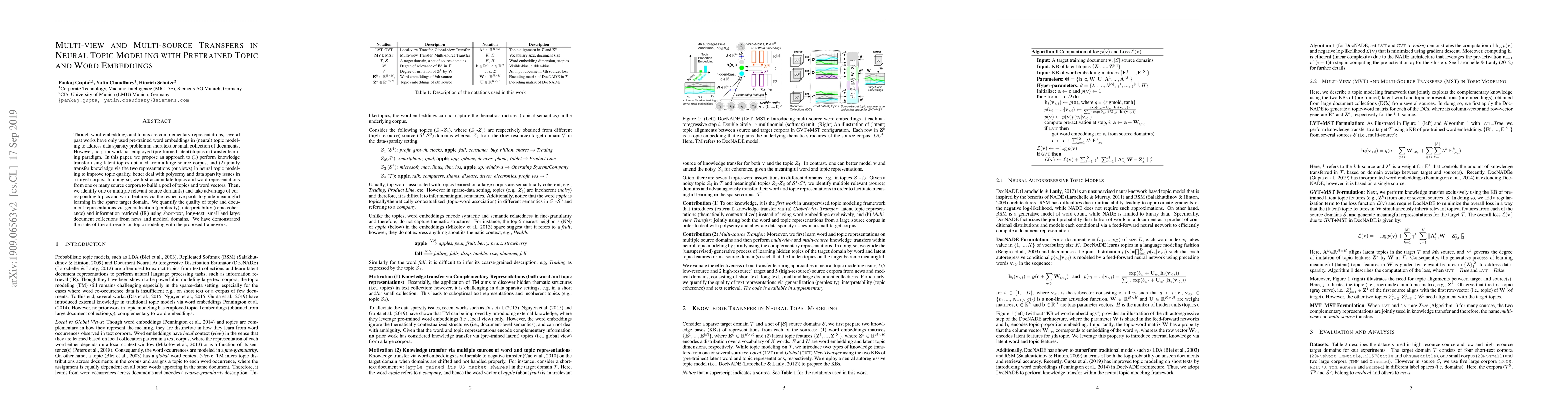 This paper proposes a novel neural topic modeling framework that leverages both pre-trained word embeddings and latent topics from large source corpora to enhance knowledge transfer in sparse target domains, achieving state-of-the-art results in handling data sparsity and polysemy issues.