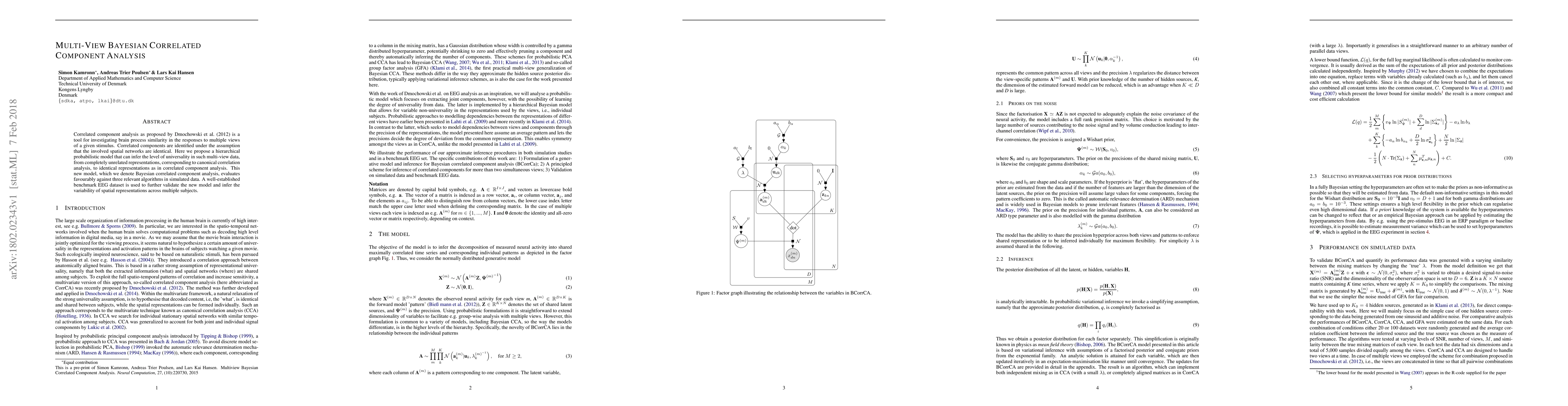 Correlated component analysis as proposed by Dmochowski et al. (2012) is a tool for investigating brain process similarity in the responses to multiple views of a given stimulus. Correlated components are identified under the assumption that the involved spatial networks are identical. Here we propose a hierarchical probabilistic model that can infer the level of universality in such multi-view data, from completely unrelated representations, corresponding to canonical correlation analysis, to identical representations as in correlated component analysis. This new model, which we denote Bayesian correlated component analysis, evaluates favourably against three relevant algorithms in simulated data. A well-established benchmark EEG dataset is used to further validate the new model and infer the variability of spatial representations across multiple subjects.