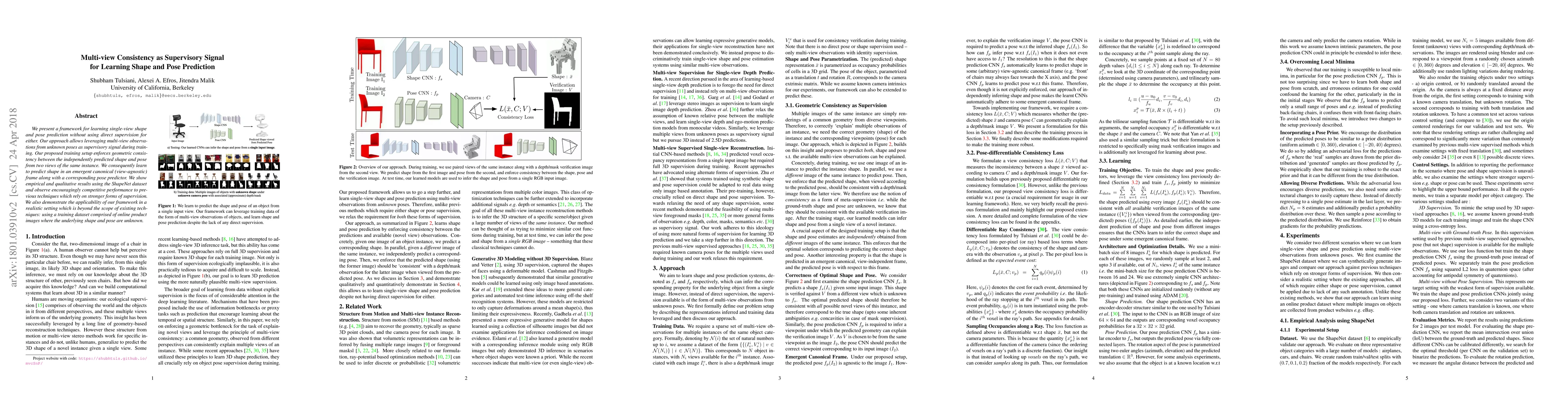 We present a framework for learning single-view shape and pose prediction without using direct supervision for either. Our approach allows leveraging multi-view observations from unknown poses as supervisory signal during training. Our proposed training setup enforces geometric consistency between the independently predicted shape and pose from two views of the same instance. We consequently learn to predict shape in an emergent canonical (view-agnostic) frame along with a corresponding pose predictor. We show empirical and qualitative results using the ShapeNet dataset and observe encouragingly competitive performance to previous techniques which rely on stronger forms of supervision. We also demonstrate the applicability of our framework in a realistic setting which is beyond the scope of existing techniques: using a training dataset comprised of online product images where the underlying shape and pose are unknown.