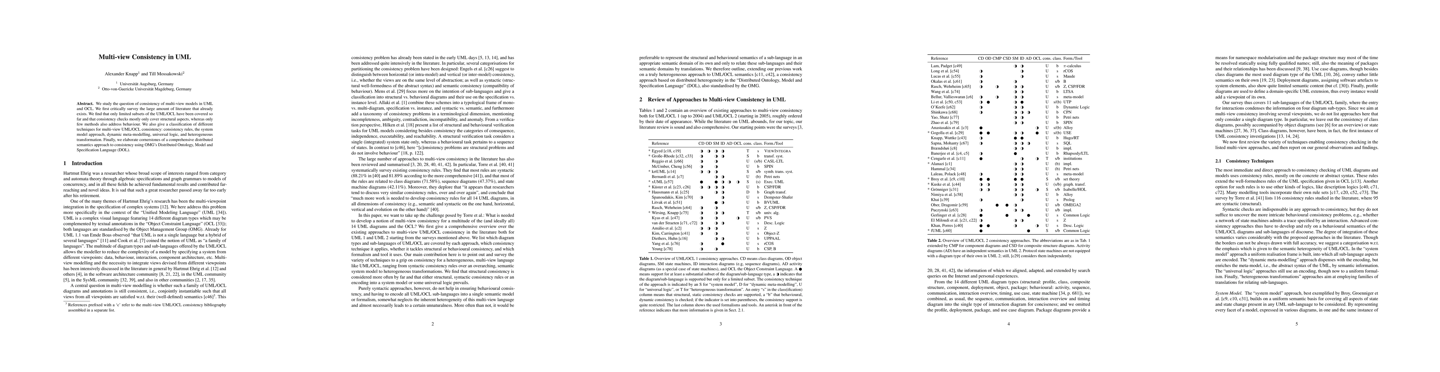 This paper surveys existing literature on multi-view consistency in UML and OCL, highlighting the limited coverage of behavioral aspects and classifying techniques like consistency rules and the system model approach. It proposes a comprehensive distributed semantics approach using OMG's DOL for improved consistency.