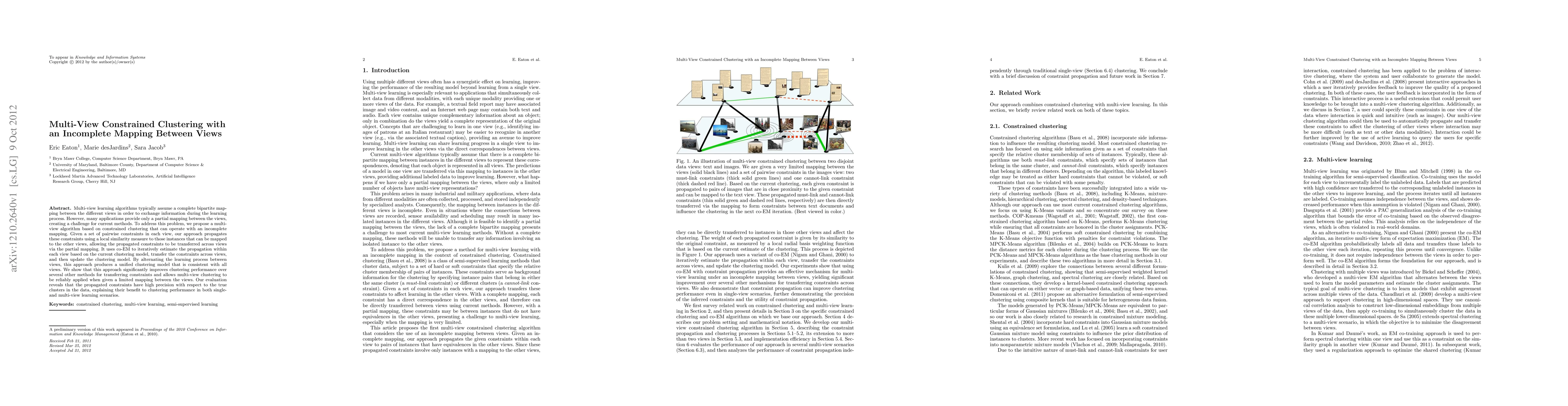This paper proposes a multi-view clustering algorithm that handles incomplete mappings between views by using pairwise constraints and local similarity measures. The method iteratively updates the clustering model across views using co-EM, demonstrating improved performance and precision in clustering compared to other methods.