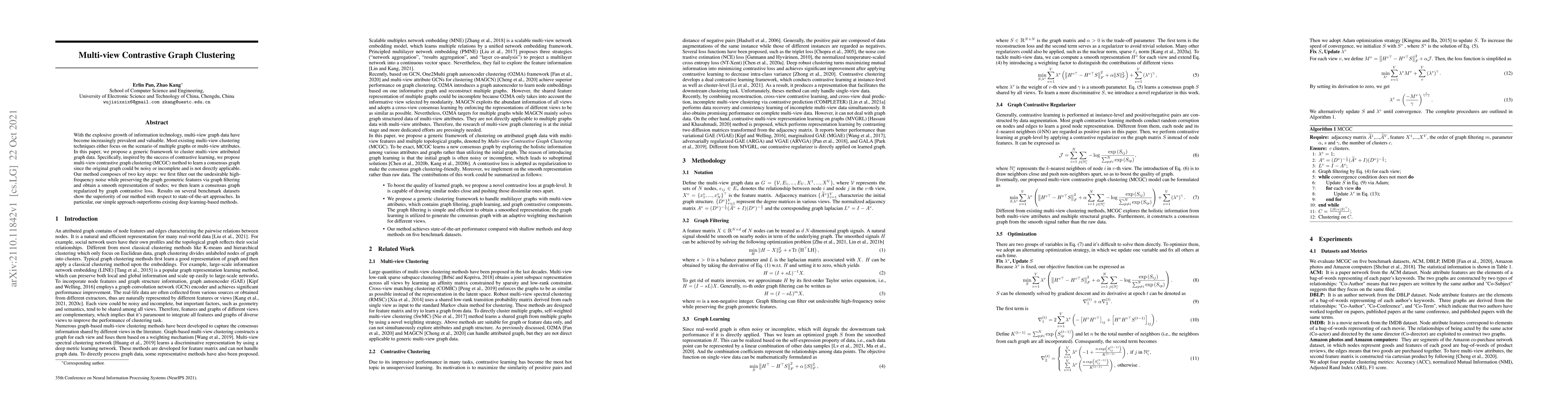 This paper proposes a multi-view contrastive graph clustering (MCGC) framework to cluster multi-view attributed graph data, addressing the limitations of existing techniques. The method filters noise while preserving graph features and learns a consensus graph using graph contrastive loss, achieving superior performance compared to state-of-the-art approaches.