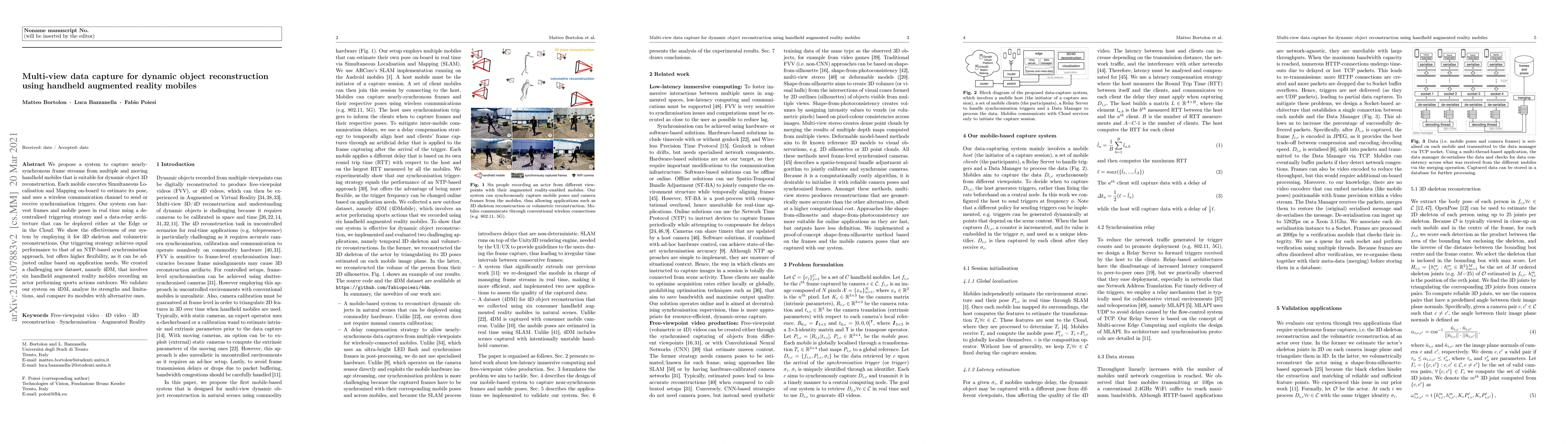 The research introduces a system for dynamic object 3D reconstruction using multiple moving handheld mobile devices. It employs Simultaneous Localisation and Mapping for pose estimation and wireless communication for synchronisation. The system, validated on a new dataset (4DM), demonstrates real-time data capture and comparable performance to NTP-based synchronisation, offering more flexibility for various application needs.