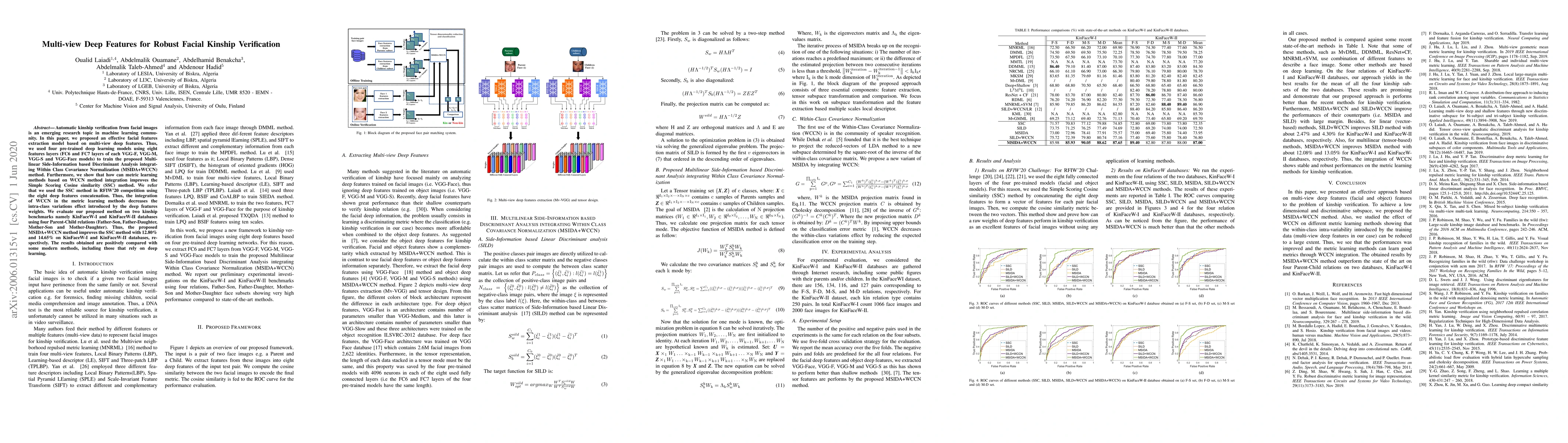 Automatic kinship verification from facial images is an emerging research topic in machine learning community. In this paper, we proposed an effective facial features extraction model based on multi-view deep features. Thus, we used four pre-trained deep learning models using eight features layers (FC6 and FC7 layers of each VGG-F, VGG-M, VGG-S and VGG-Face models) to train the proposed Multilinear Side-Information based Discriminant Analysis integrating Within Class Covariance Normalization (MSIDA+WCCN) method. Furthermore, we show that how can metric learning methods based on WCCN method integration improves the Simple Scoring Cosine similarity (SSC) method. We refer that we used the SSC method in RFIW'20 competition using the eight deep features concatenation. Thus, the integration of WCCN in the metric learning methods decreases the intra-class variations effect introduced by the deep features weights. We evaluate our proposed method on two kinship benchmarks namely KinFaceW-I and KinFaceW-II databases using four Parent-Child relations (Father-Son, Father-Daughter, Mother-Son and Mother-Daughter). Thus, the proposed MSIDA+WCCN method improves the SSC method with 12.80% and 14.65% on KinFaceW-I and KinFaceW-II databases, respectively. The results obtained are positively compared with some modern methods, including those that rely on deep learning.