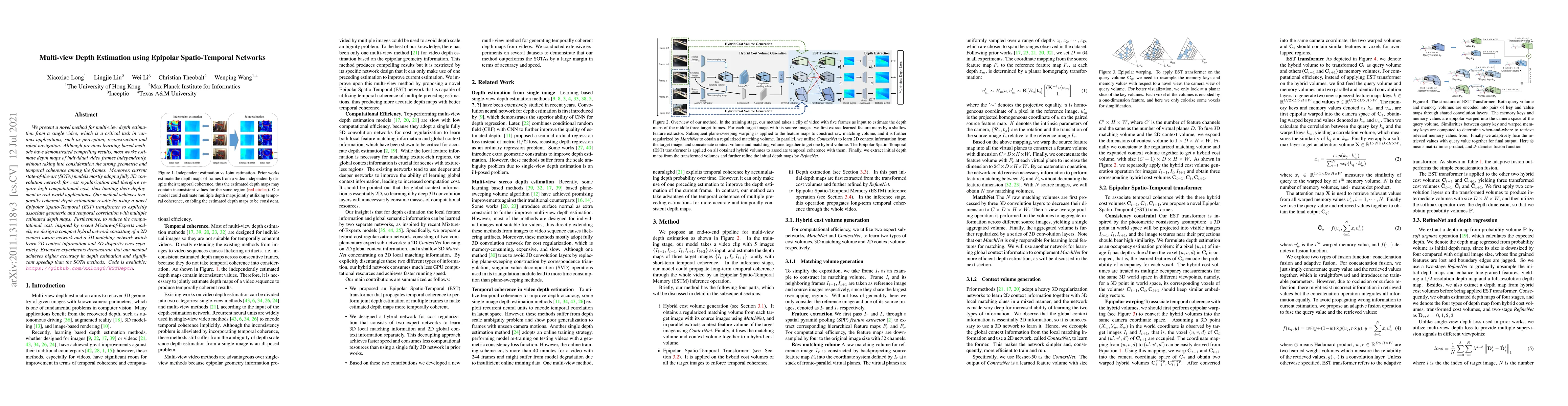 This paper introduces a novel Epipolar Spatio-Temporal (EST) transformer for multi-view depth estimation from a single video, leveraging both geometric and temporal coherence. To reduce computational costs, it employs a hybrid network combining 2D and 3D networks, achieving higher accuracy and faster speed compared to state-of-the-art methods.