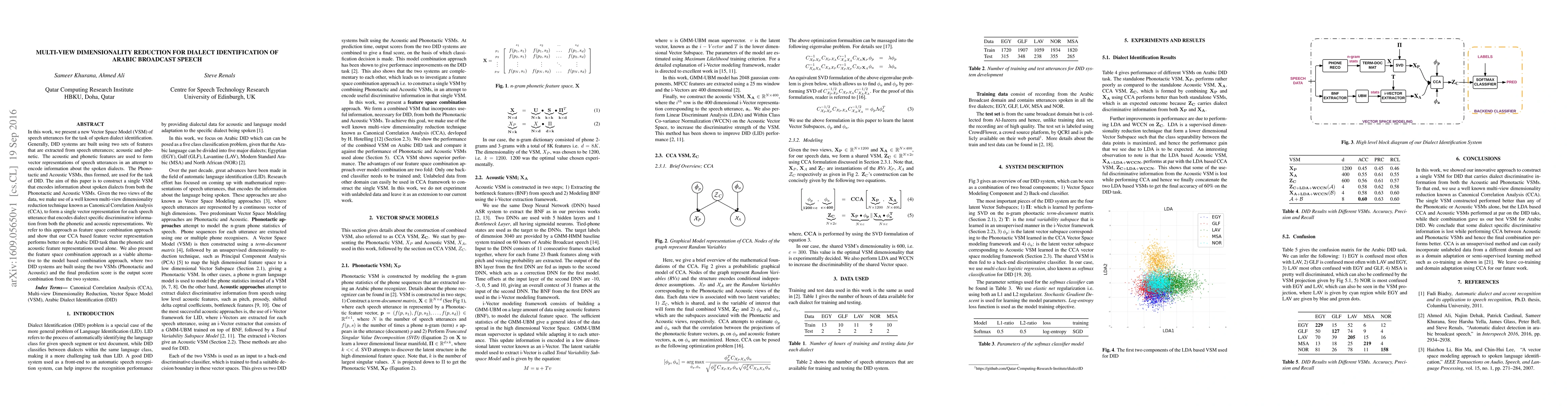 In this work, we present a new Vector Space Model (VSM) of speech utterances for the task of spoken dialect identification. Generally, DID systems are built using two sets of features that are extracted from speech utterances; acoustic and phonetic. The acoustic and phonetic features are used to form vector representations of speech utterances in an attempt to encode information about the spoken dialects. The Phonotactic and Acoustic VSMs, thus formed, are used for the task of DID. The aim of this paper is to construct a single VSM that encodes information about spoken dialects from both the Phonotactic and Acoustic VSMs. Given the two views of the data, we make use of a well known multi-view dimensionality reduction technique known as Canonical Correlation Analysis (CCA), to form a single vector representation for each speech utterance that encodes dialect specific discriminative information from both the phonetic and acoustic representations. We refer to this approach as feature space combination approach and show that our CCA based feature vector representation performs better on the Arabic DID task than the phonetic and acoustic feature representations used alone. We also present the feature space combination approach as a viable alternative to the model based combination approach, where two DID systems are built using the two VSMs (Phonotactic and Acoustic) and the final prediction score is the output score combination from the two systems.