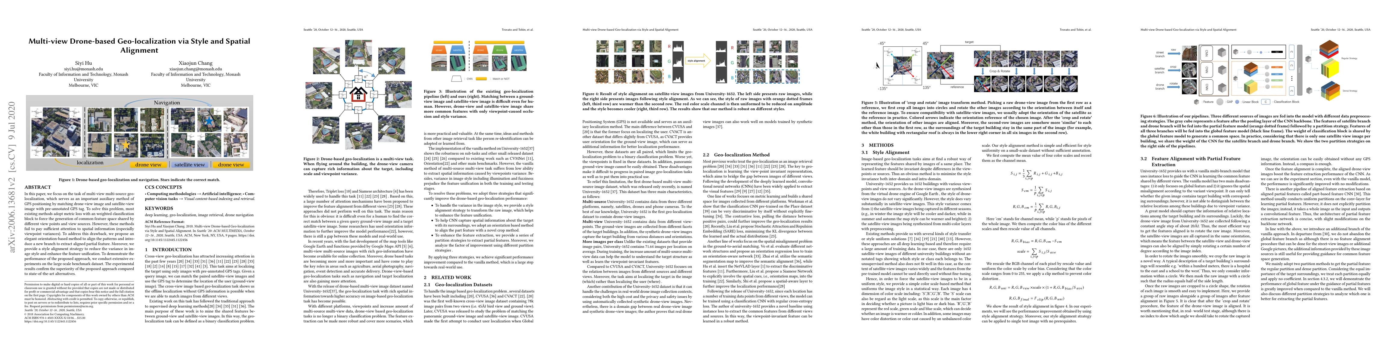 In this paper, we focus on the task of multi-view multi-source geo-localization, which serves as an important auxiliary method of GPS positioning by matching drone-view image and satellite-view image with pre-annotated GPS tag. To solve this problem, most existing methods adopt metric loss with an weighted classification block to force the generation of common feature space shared by different view points and view sources. However, these methods fail to pay sufficient attention to spatial information (especially viewpoint variances). To address this drawback, we propose an elegant orientation-based method to align the patterns and introduce a new branch to extract aligned partial feature. Moreover, we provide a style alignment strategy to reduce the variance in image style and enhance the feature unification. To demonstrate the performance of the proposed approach, we conduct extensive experiments on the large-scale benchmark dataset. The experimental results confirm the superiority of the proposed approach compared to state-of-the-art alternatives.