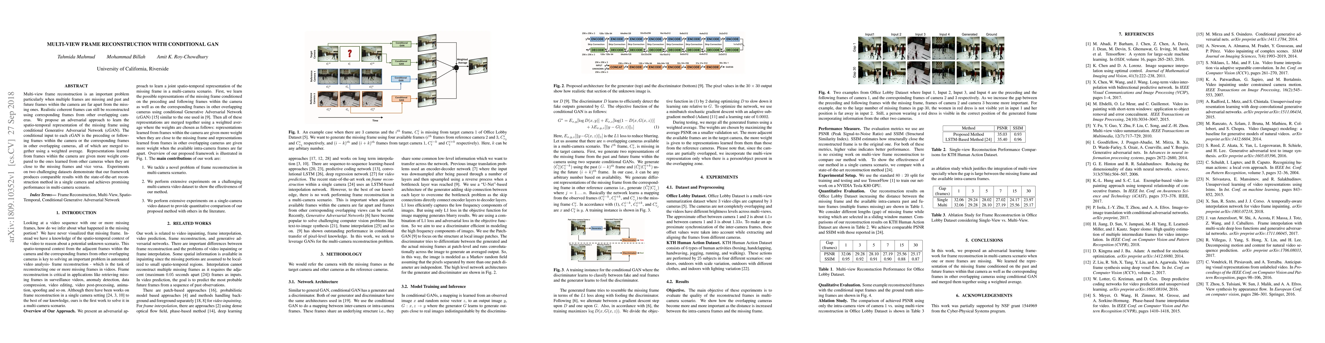 Multi-view frame reconstruction is an important problem particularly when multiple frames are missing and past and future frames within the camera are far apart from the missing ones. Realistic coherent frames can still be reconstructed using corresponding frames from other overlapping cameras. We propose an adversarial approach to learn the spatio-temporal representation of the missing frame using conditional Generative Adversarial Network (cGAN). The conditional input to each cGAN is the preceding or following frames within the camera or the corresponding frames in other overlapping cameras, all of which are merged together using a weighted average. Representations learned from frames within the camera are given more weight compared to the ones learned from other cameras when they are close to the missing frames and vice versa. Experiments on two challenging datasets demonstrate that our framework produces comparable results with the state-of-the-art reconstruction method in a single camera and achieves promising performance in multi-camera scenario.
