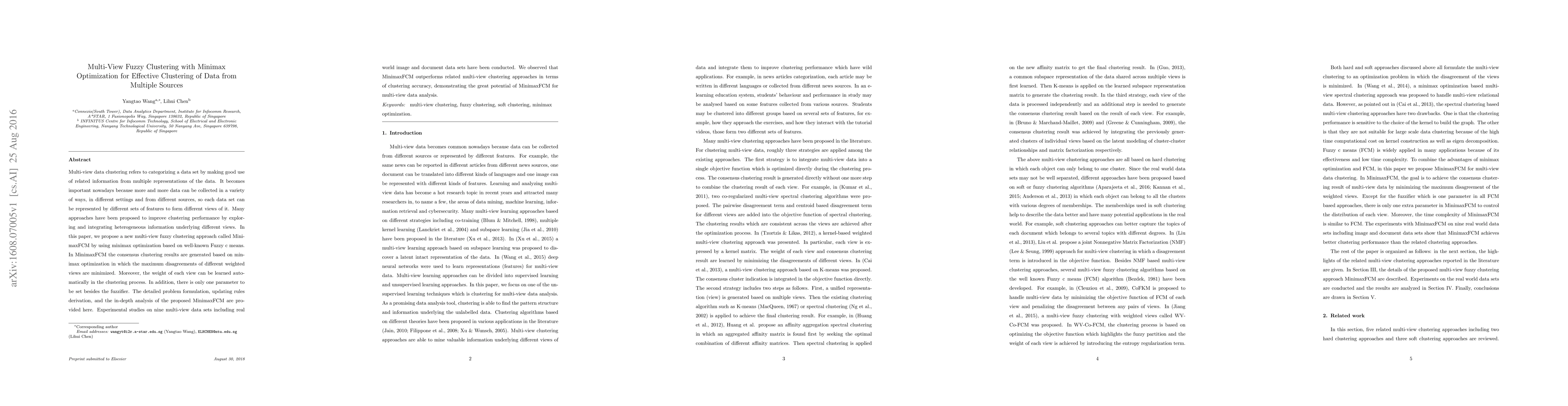 This paper introduces MinimaxFCM, a multi-view fuzzy clustering method using minimax optimization to minimize maximum disagreements among weighted views, achieving superior clustering accuracy on nine multi-view datasets compared to existing methods. The approach automatically learns view weights and requires only one parameter beyond the fuzzifier.