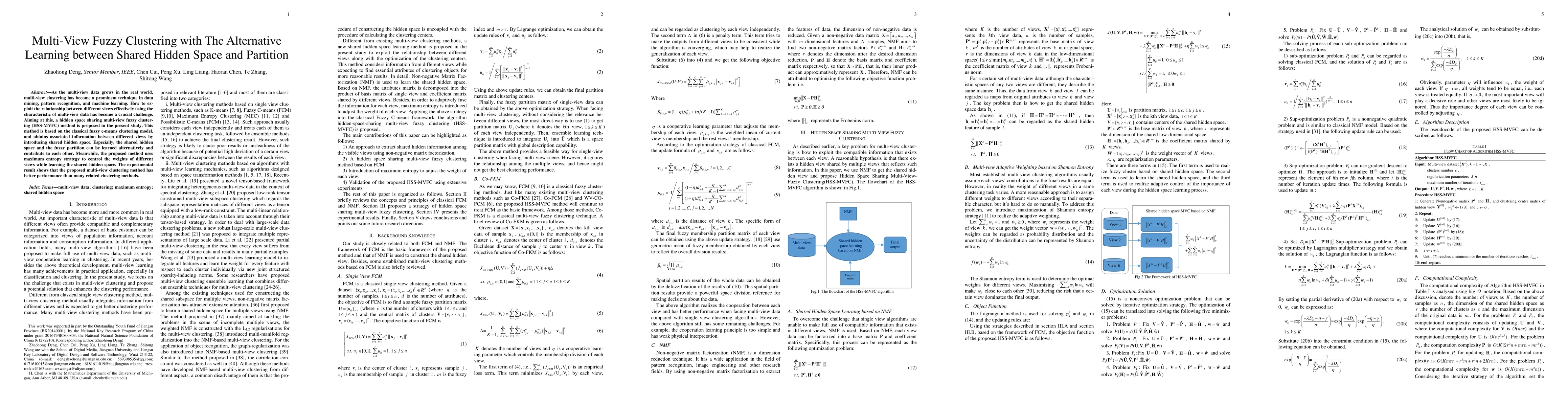 This paper proposes a hidden space sharing multi-view fuzzy clustering (HSS-MVFC) method that leverages an alternative learning approach between shared hidden space and partition to effectively exploit relationships between different views. The method uses a maximum entropy strategy to balance view weights, demonstrating superior performance in clustering compared to other related methods.