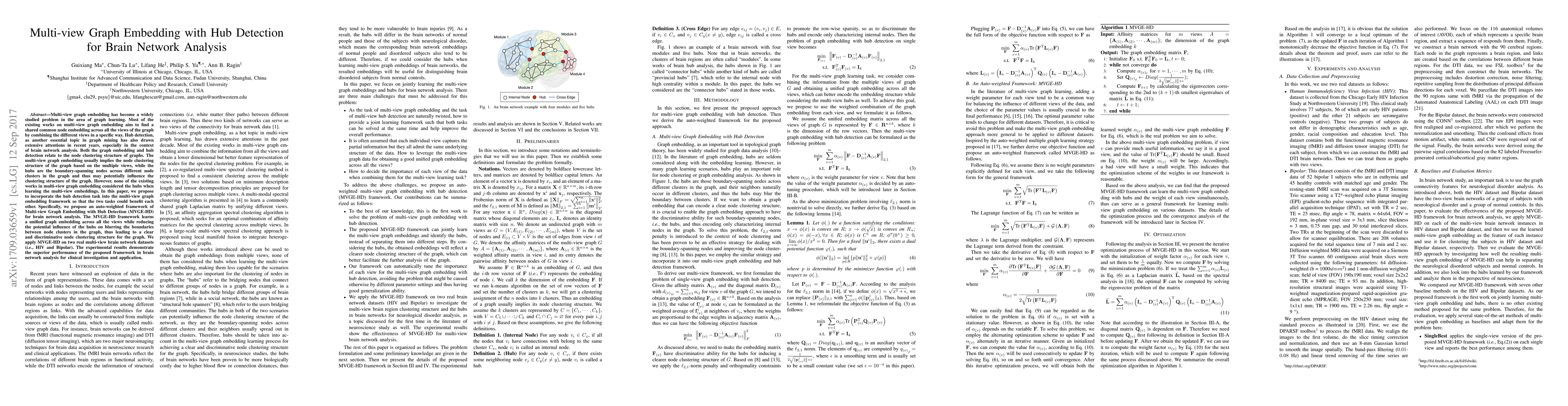 This paper proposes a novel framework called Multi-view Graph Embedding with Hub Detection (MVGE-HD) to integrate hub detection into multi-view graph embedding for brain network analysis. The framework aims to learn a unified graph embedding while minimizing hub influence on node clustering, leading to clearer and more discriminative clustering structures. Experimental results on HIV and Bipolar brain network datasets show superior performance in clinical applications.