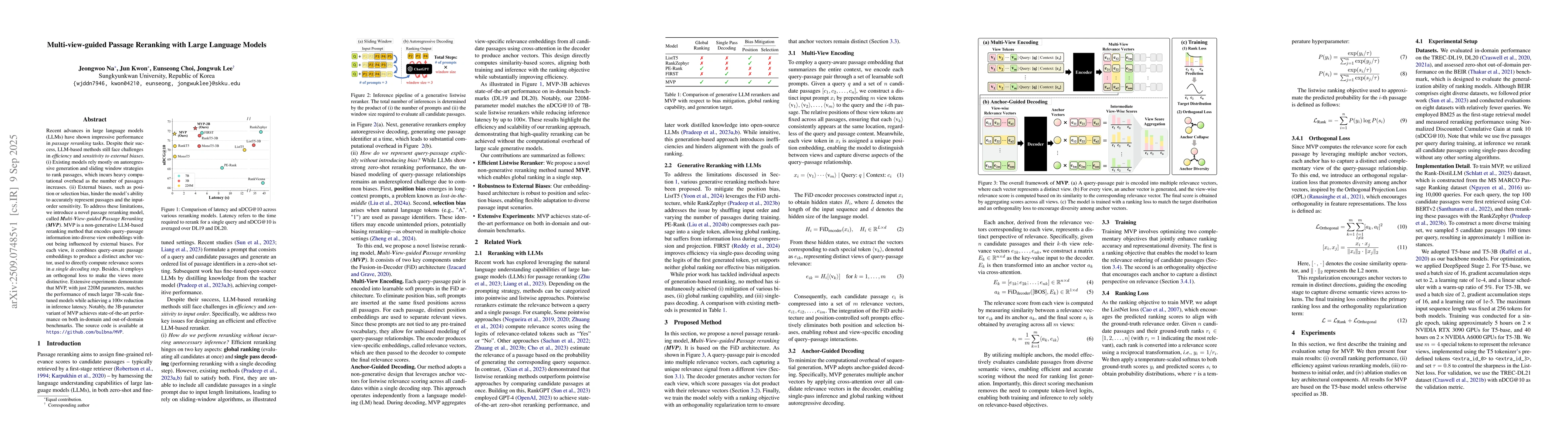 Recent advances in large language models (LLMs) have shown impressive performance in passage reranking tasks. Despite their success, LLM-based methods still face challenges in efficiency and sensitivity to external biases. (1) Existing models rely mostly on autoregressive generation and sliding window strategies to rank passages, which incur heavy computational overhead as the number of passages increases. (2) External biases, such as position or selection bias, hinder the model's ability to accurately represent passages and increase input-order sensitivity. To address these limitations, we introduce a novel passage reranking model, called Multi-View-guided Passage Reranking (MVP). MVP is a non-generative LLM-based reranking method that encodes query-passage information into diverse view embeddings without being influenced by external biases. For each view, it combines query-aware passage embeddings to produce a distinct anchor vector, which is then used to directly compute relevance scores in a single decoding step. In addition, it employs an orthogonal loss to make the views more distinctive. Extensive experiments demonstrate that MVP, with just 220M parameters, matches the performance of much larger 7B-scale fine-tuned models while achieving a 100x reduction in inference latency. Notably, the 3B-parameter variant of MVP achieves state-of-the-art performance on both in-domain and out-of-domain benchmarks. The source code is available at: https://github.com/bulbna/MVP