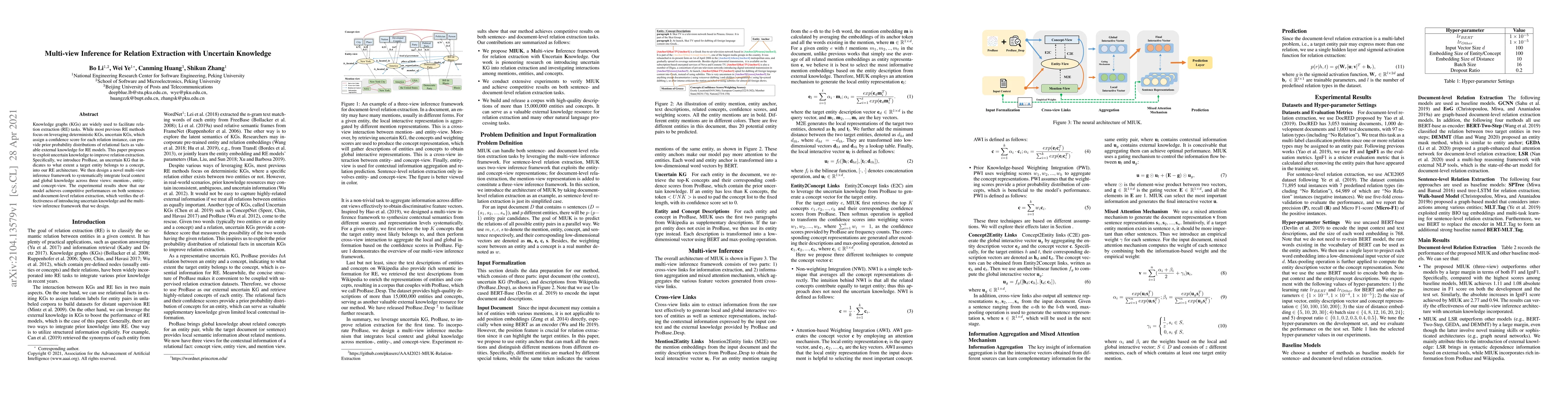 This paper proposes ProBase, an uncertain knowledge graph, to enhance relation extraction by incorporating confidence scores. It introduces a multi-view inference framework integrating local context and global knowledge across mention, entity, and concept views, achieving competitive performance in relation extraction tasks.