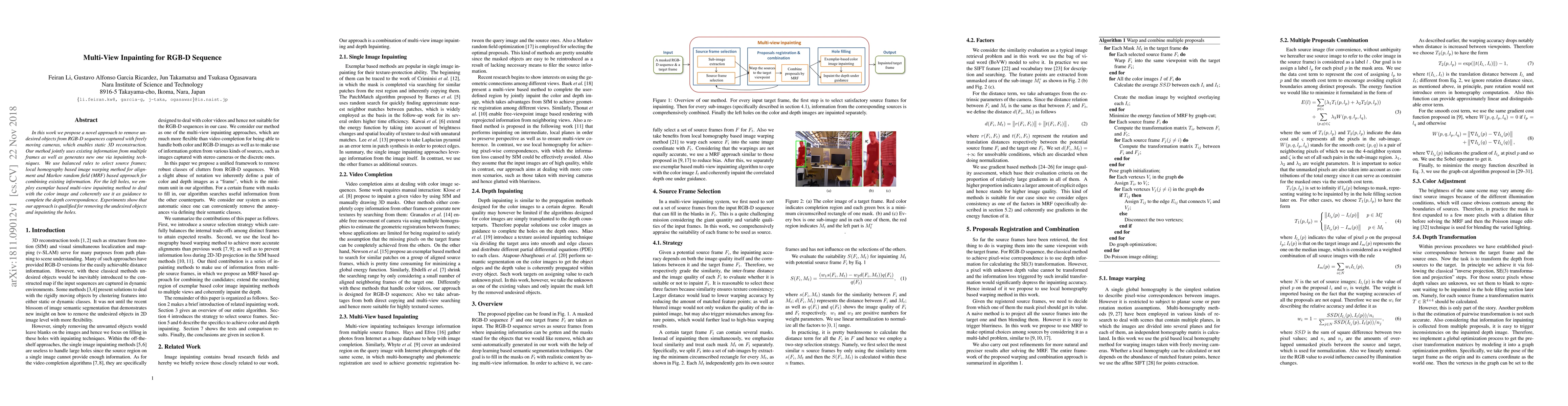 Researchers propose a method to remove unwanted objects from RGB-D sequences using multiple frames and inpainting techniques, enabling static 3D reconstruction. The approach successfully removes undesired objects and fills in holes with high accuracy.