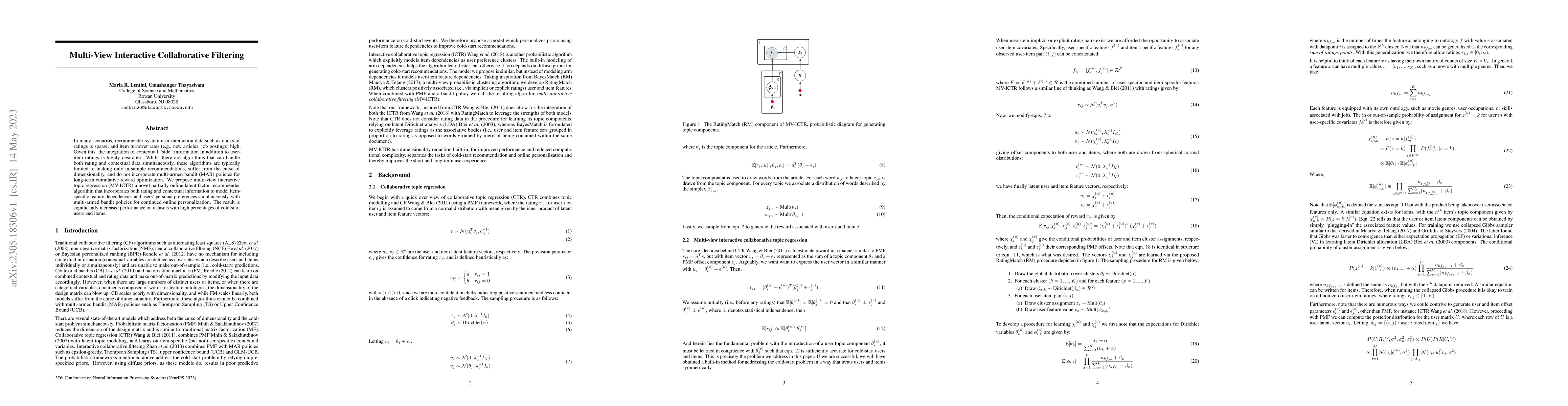 In many scenarios, recommender system user interaction data such as clicks or ratings is sparse, and item turnover rates (e.g., new articles, job postings) high. Given this, the integration of contextual "side" information in addition to user-item ratings is highly desirable. Whilst there are algorithms that can handle both rating and contextual data simultaneously, these algorithms are typically limited to making only in-sample recommendations, suffer from the curse of dimensionality, and do not incorporate multi-armed bandit (MAB) policies for long-term cumulative reward optimization. We propose multi-view interactive topic regression (MV-ICTR) a novel partially online latent factor recommender algorithm that incorporates both rating and contextual information to model item-specific feature dependencies and users' personal preferences simultaneously, with multi-armed bandit policies for continued online personalization. The result is significantly increased performance on datasets with high percentages of cold-start users and items.