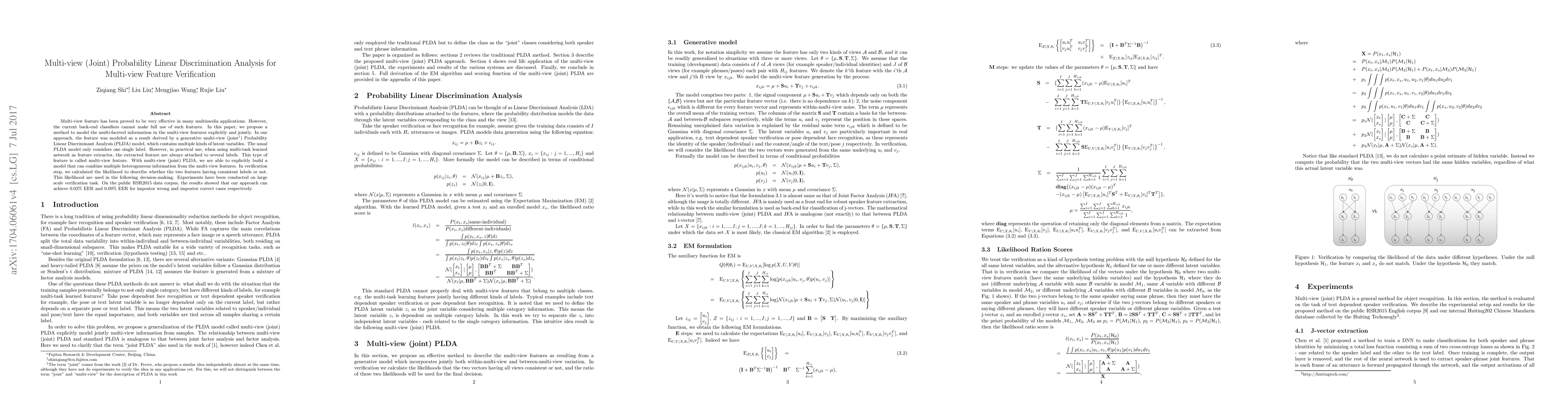 Multi-view feature has been proved to be very effective in many multimedia applications. However, the current back-end classifiers cannot make full use of such features. In this paper, we propose a method to model the multi-faceted information in the multi-view features explicitly and jointly. In our approach, the feature was modeled as a result derived by a generative multi-view (joint\footnotemark[1]) Probability Linear Discriminant Analysis (PLDA) model, which contains multiple kinds of latent variables. The usual PLDA model only considers one single label. However, in practical use, when using multi-task learned network as feature extractor, the extracted feature are always attached to several labels. This type of feature is called multi-view feature. With multi-view (joint) PLDA, we are able to explicitly build a model that can combine multiple heterogeneous information from the multi-view features. In verification step, we calculated the likelihood to describe whether the two features having consistent labels or not. This likelihood are used in the following decision-making. Experiments have been conducted on large scale verification task. On the public RSR2015 data corpus, the results showed that our approach can achieve 0.02\% EER and 0.09\% EER for impostor wrong and impostor correct cases respectively.