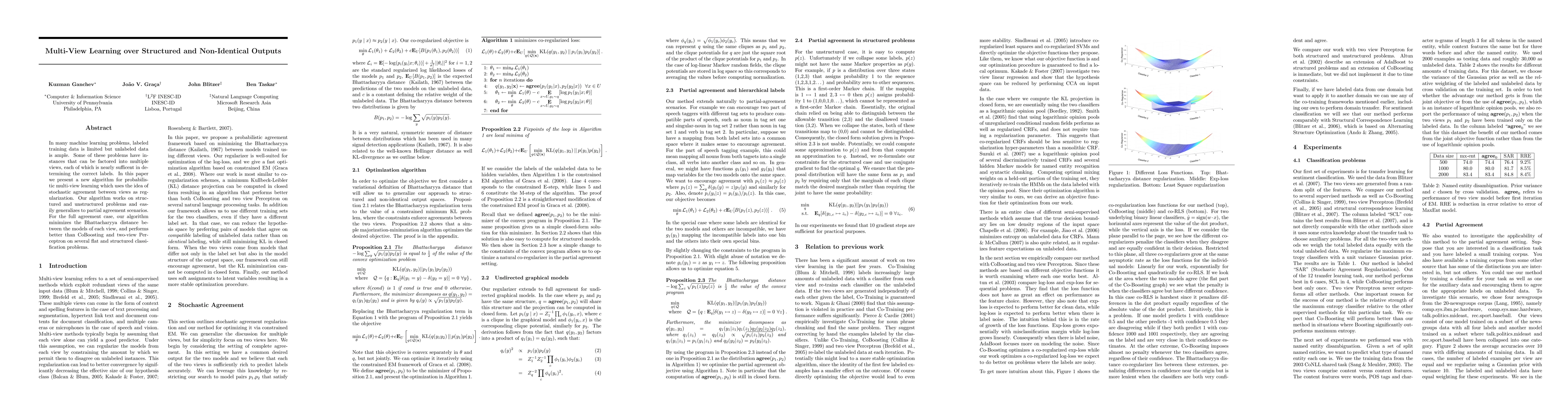 This paper introduces a novel probabilistic multi-view learning algorithm that leverages stochastic agreement between views as regularization. The algorithm effectively handles both structured and non-identical outputs, outperforming existing methods like CoBoosting and two-view Perceptron on various classification tasks.