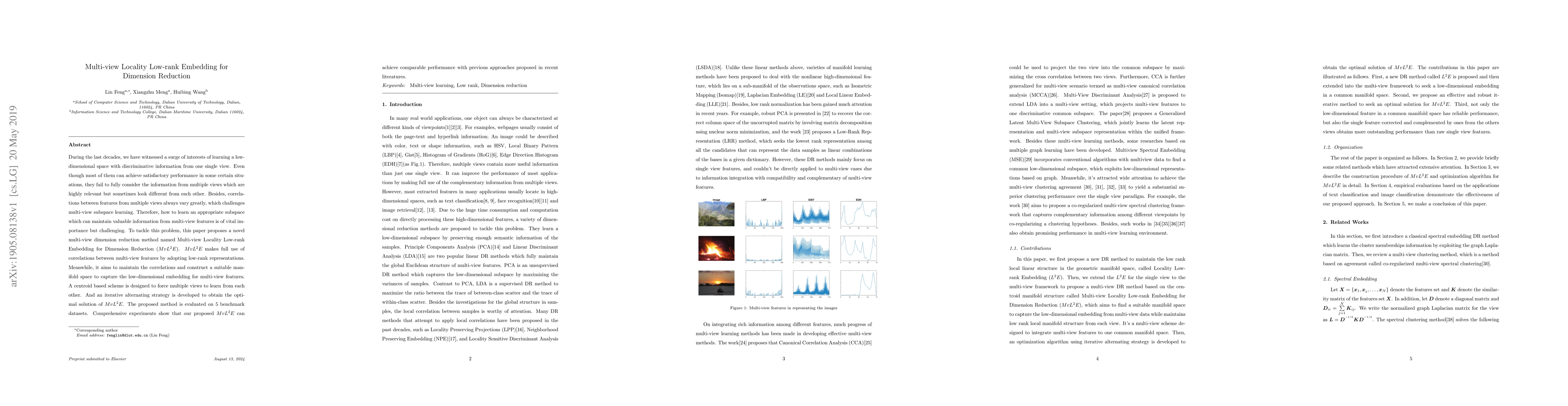 This paper introduces a novel method called Multi-view Locality Low-rank Embedding for Dimension Reduction (MvL2E) to effectively reduce dimensions while leveraging information from multiple views. The method uses low-rank representations to capture the correlations between features and constructs a suitable manifold space, achieving comparable performance on benchmark datasets.