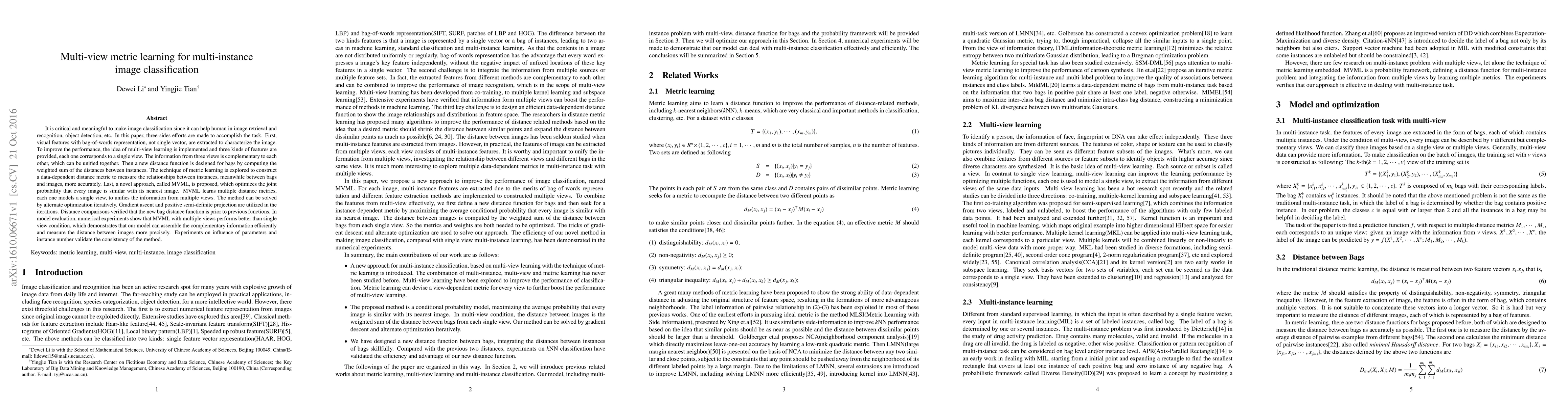 It is critical and meaningful to make image classification since it can help human in image retrieval and recognition, object detection, etc. In this paper, three-sides efforts are made to accomplish the task. First, visual features with bag-of-words representation, not single vector, are extracted to characterize the image. To improve the performance, the idea of multi-view learning is implemented and three kinds of features are provided, each one corresponds to a single view. The information from three views is complementary to each other, which can be unified together. Then a new distance function is designed for bags by computing the weighted sum of the distances between instances. The technique of metric learning is explored to construct a data-dependent distance metric to measure the relationships between instances, meanwhile between bags and images, more accurately. Last, a novel approach, called MVML, is proposed, which optimizes the joint probability that every image is similar with its nearest image. MVML learns multiple distance metrics, each one models a single view, to unifies the information from multiple views. The method can be solved by alternate optimization iteratively. Gradient ascent and positive semi-definite projection are utilized in the iterations. Distance comparisons verified that the new bag distance function is prior to previous functions. In model evaluation, numerical experiments show that MVML with multiple views performs better than single view condition, which demonstrates that our model can assemble the complementary information efficiently and measure the distance between images more precisely. Experiments on influence of parameters and instance number validate the consistency of the method.