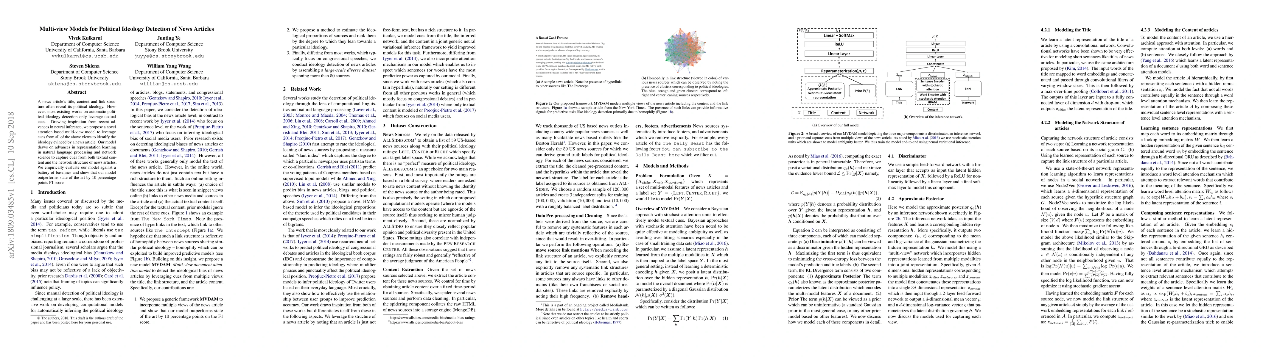 This paper proposes a multi-view model leveraging title, content, and link structure to detect political ideology in news articles. It combines textual cues with network structure insights, outperforming existing methods by 10 percentage points in F1 score.
