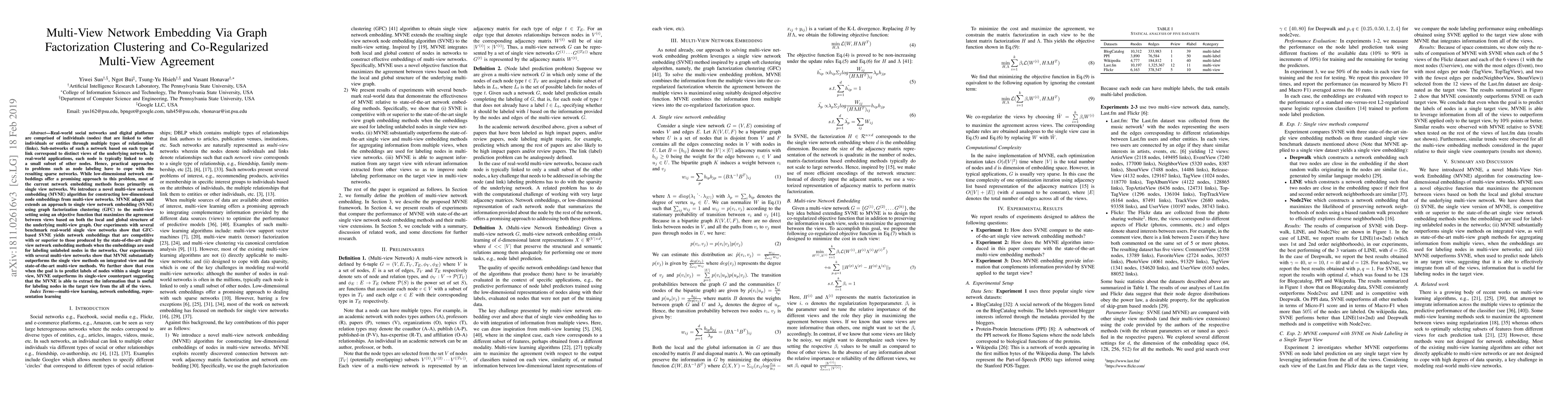 This paper introduces a novel multi-view network embedding (MVNE) algorithm that extends graph factorization clustering to multi-view networks, achieving competitive embeddings for single view networks and significantly outperforming single view methods on multi-view networks, demonstrating its effectiveness in node labeling across different views.