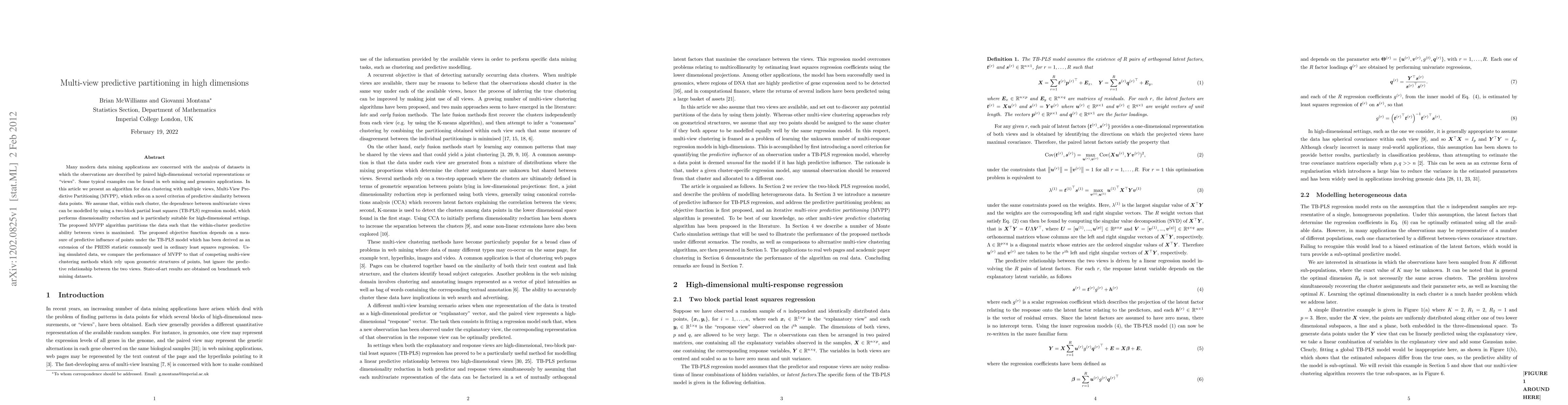 Many modern data mining applications are concerned with the analysis of datasets in which the observations are described by paired high-dimensional vectorial representations or "views". Some typical examples can be found in web mining and genomics applications. In this article we present an algorithm for data clustering with multiple views, Multi-View Predictive Partitioning (MVPP), which relies on a novel criterion of predictive similarity between data points. We assume that, within each cluster, the dependence between multivariate views can be modelled by using a two-block partial least squares (TB-PLS) regression model, which performs dimensionality reduction and is particularly suitable for high-dimensional settings. The proposed MVPP algorithm partitions the data such that the within-cluster predictive ability between views is maximised. The proposed objective function depends on a measure of predictive influence of points under the TB-PLS model which has been derived as an extension of the PRESS statistic commonly used in ordinary least squares regression. Using simulated data, we compare the performance of MVPP to that of competing multi-view clustering methods which rely upon geometric structures of points, but ignore the predictive relationship between the two views. State-of-art results are obtained on benchmark web mining datasets.