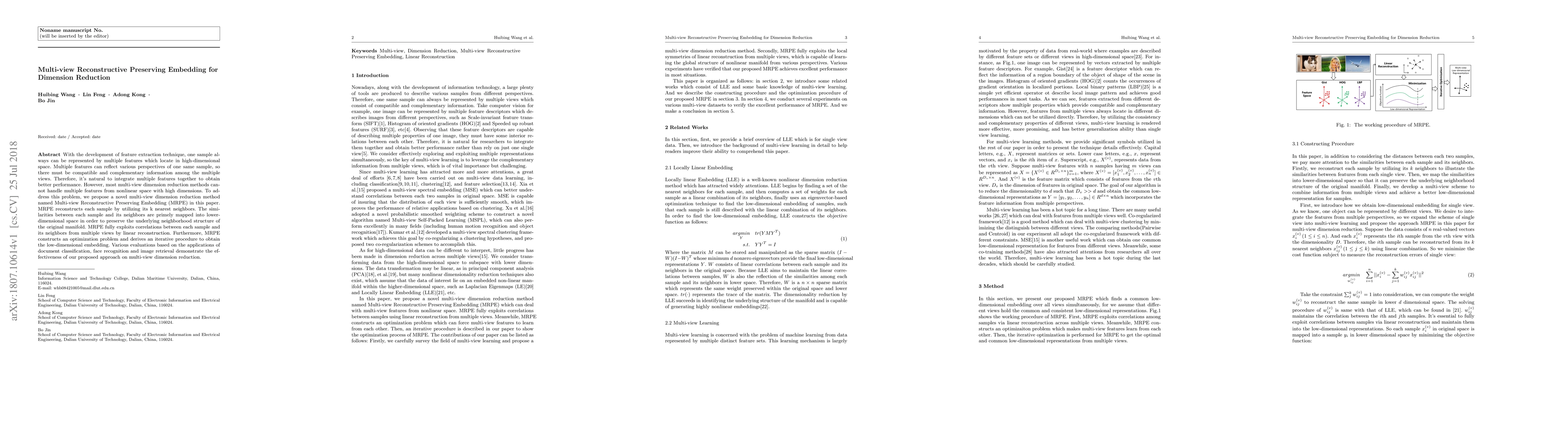 The paper proposes a novel Multi-view Reconstructive Preserving Embedding (MRPE) method for dimension reduction that integrates multiple features from nonlinear high-dimensional spaces. MRPE reconstructs samples using their k nearest neighbors to preserve the original manifold's neighborhood structure, demonstrating effectiveness in document classification, face recognition, and image retrieval.