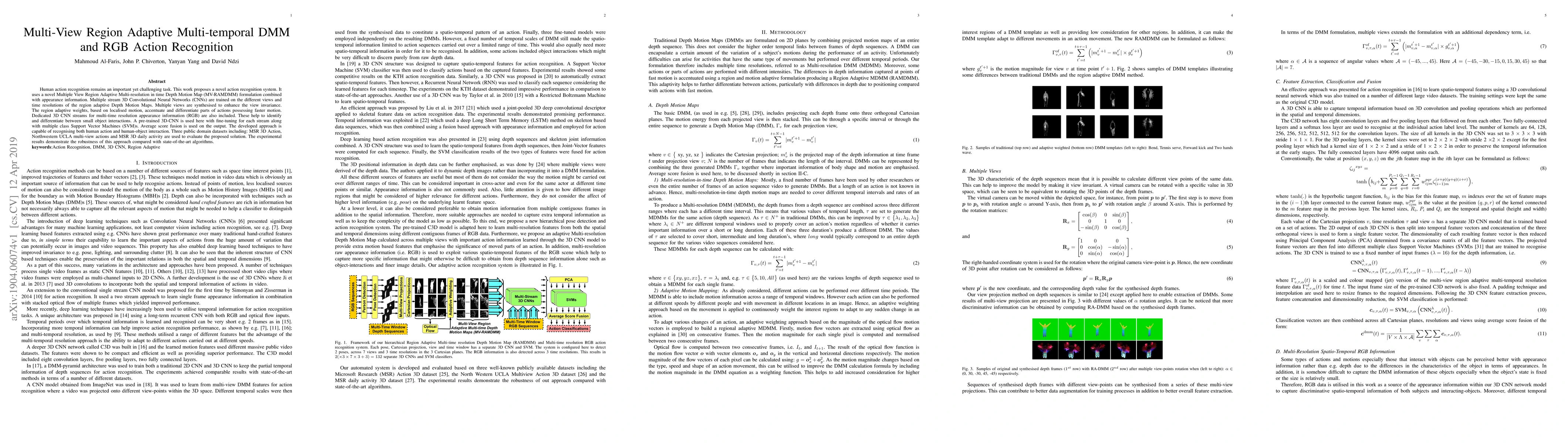 This paper proposes a novel multi-view region adaptive multi-temporal DMM and RGB action recognition system using 3D CNNs trained on Depth Motion Maps and appearance information. The approach combines region adaptive weights and multiple class SVMs for robust recognition of human actions and interactions, outperforming state-of-the-art methods on three public datasets.