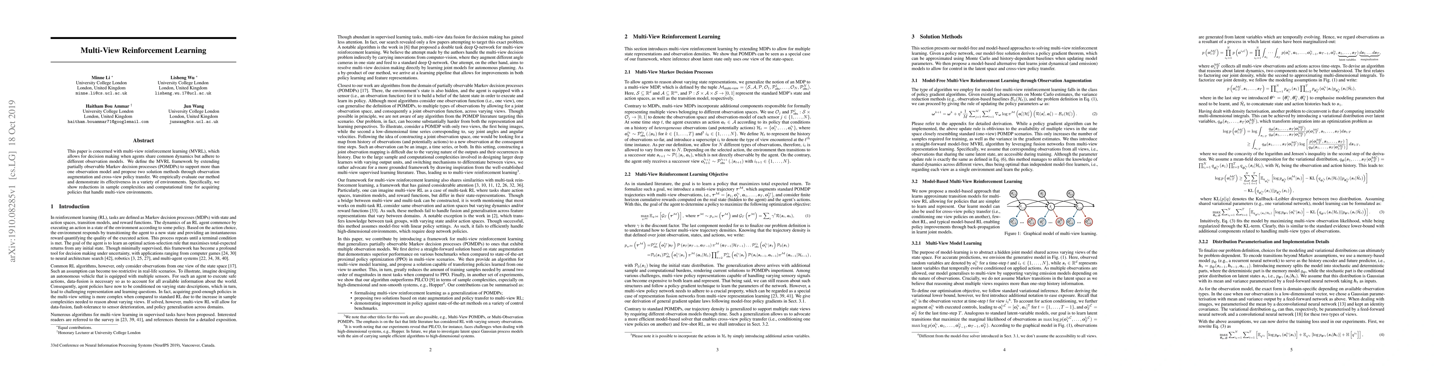 This paper introduces multi-view reinforcement learning, a method that enables decision making in environments with shared dynamics but different observation models. It shows improved efficiency and effectiveness in acquiring policies for complex multi-view environments.