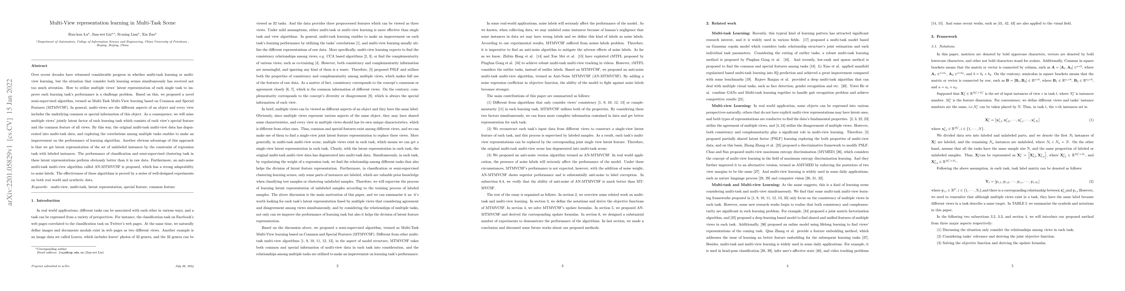 This paper proposes a novel semi-supervised algorithm, MTMVCSF, to improve multi-task learning performance by leveraging multi-view latent representations. The algorithm mines common and special features from multiple views to enhance task correlations and obtain better latent representations, which improve classification and semi-supervised clustering performance. An anti-noise variant, AN-MTMVCSF, is also introduced for robustness to noisy labels, validated through experiments on real and synthetic data.