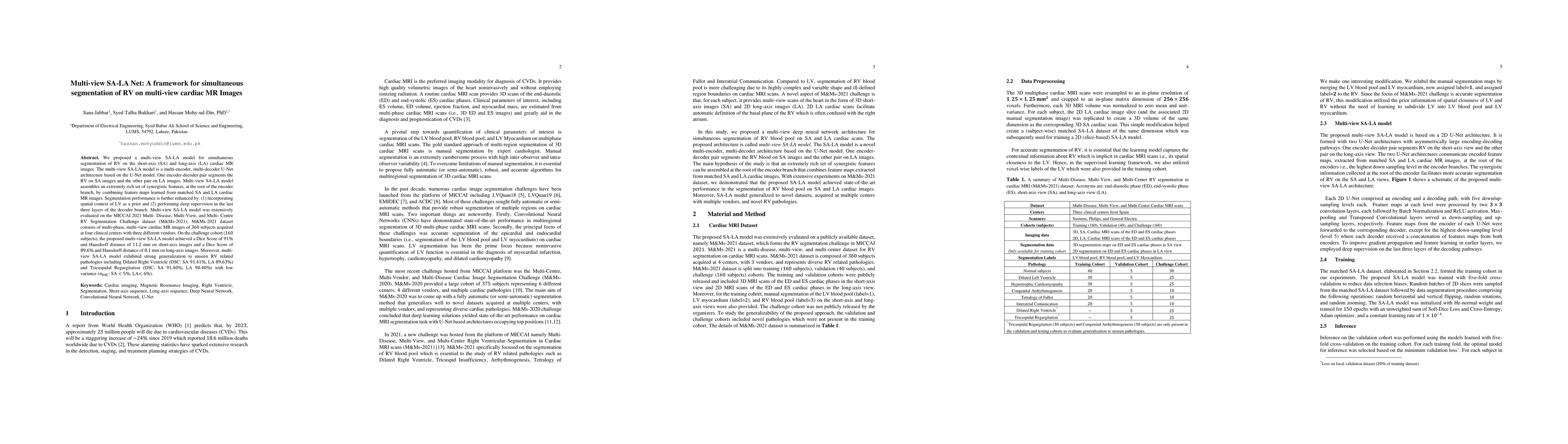 A new model called multi-view SA-LA Net improves cardiac MR image segmentation of the right ventricle by combining short-axis and long-axis images.