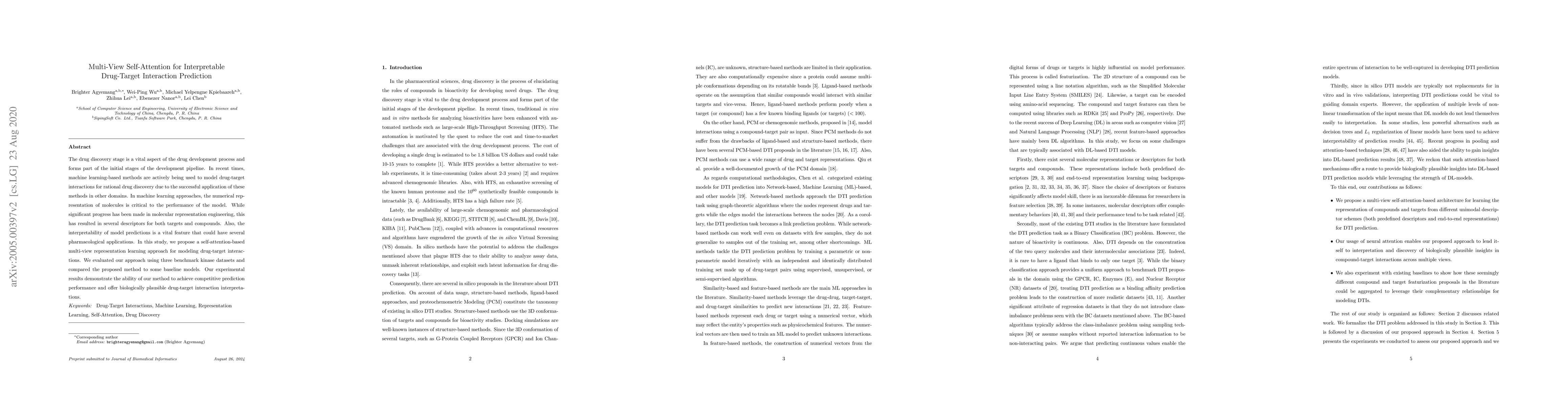 This paper proposes a self-attention-based multi-view representation learning approach for predicting drug-target interactions, achieving competitive performance and providing biologically interpretable results. The method was evaluated on three kinase datasets, demonstrating its effectiveness compared to baseline models.