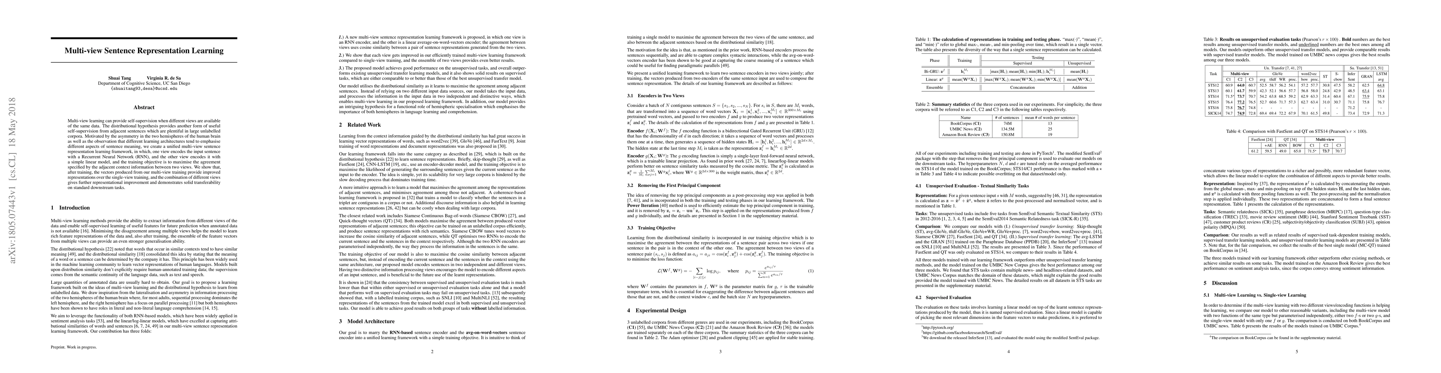 This paper proposes a multi-view sentence representation learning framework that leverages both recurrent neural networks and linear models for encoding sentences. The training objective maximizes agreement between the two views based on adjacent context information, resulting in improved and more transferable sentence representations compared to single-view methods.