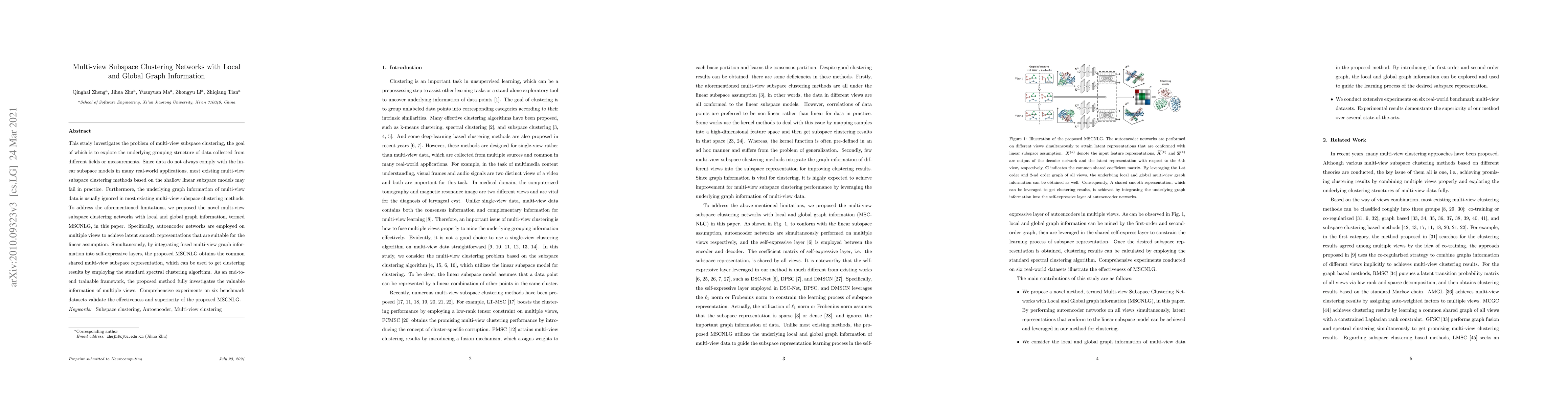 This study proposes MSCNLG, a multi-view subspace clustering network that integrates local and global graph information to address the limitations of existing linear subspace models. The method employs autoencoders and self-expressive layers to achieve better latent representations and clustering results, validated through experiments on six datasets.
