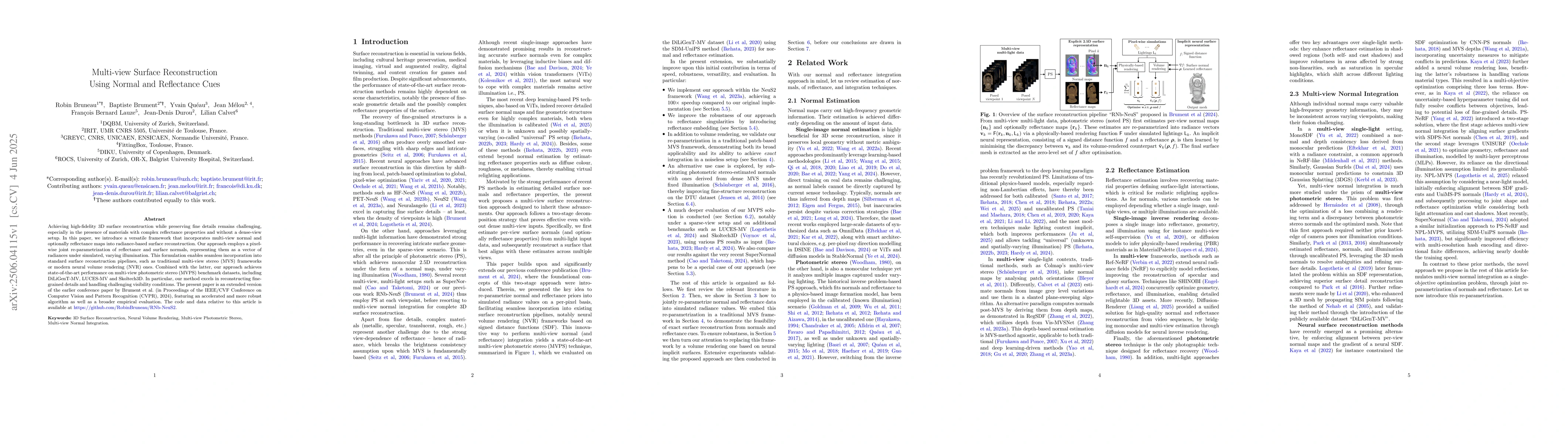 The paper presents a framework for multi-view surface reconstruction that integrates normal and reflectance cues using a pixel-wise joint re-parametrization of reflectance and surface normals as radiance vectors under simulated illumination, compatible with both traditional MVS and modern NVR pipelines.