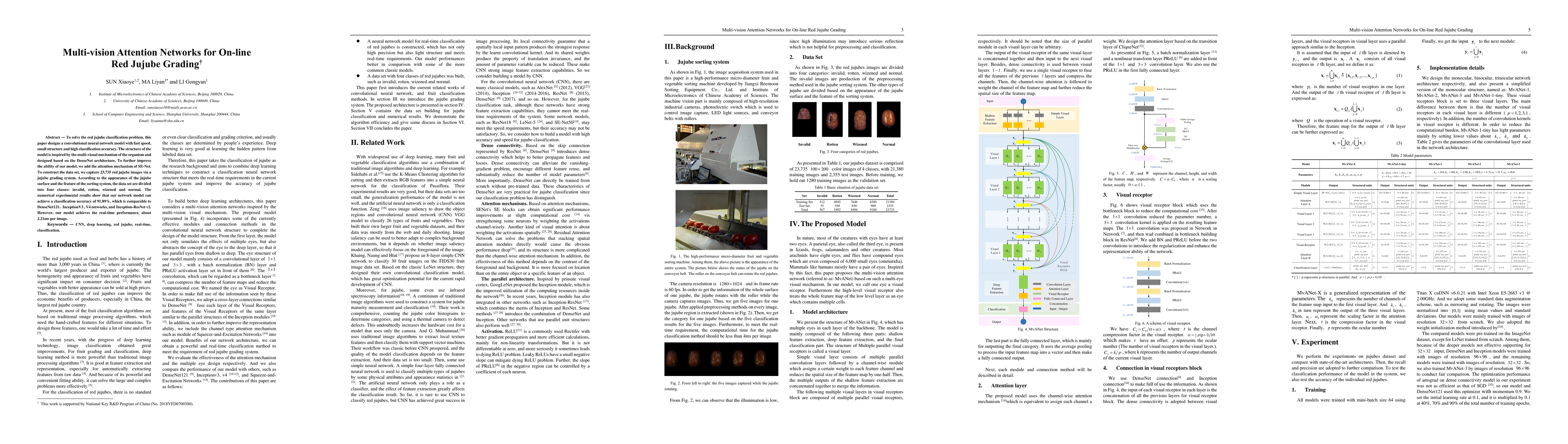 To solve the red jujube classification problem, this paper designs a convolutional neural network model with low computational cost and high classification accuracy. The architecture of the model is inspired by the multi-visual mechanism of the organism and DenseNet. To further improve our model, we add the attention mechanism of SE-Net. We also construct a dataset which contains 23,735 red jujube images captured by a jujube grading system. According to the appearance of the jujube and the characteristics of the grading system, the dataset is divided into four classes: invalid, rotten, wizened and normal. The numerical experiments show that the classification accuracy of our model reaches to 91.89%, which is comparable to DenseNet-121, InceptionV3, InceptionV4, and Inception-ResNet v2. However, our model has real-time performance.