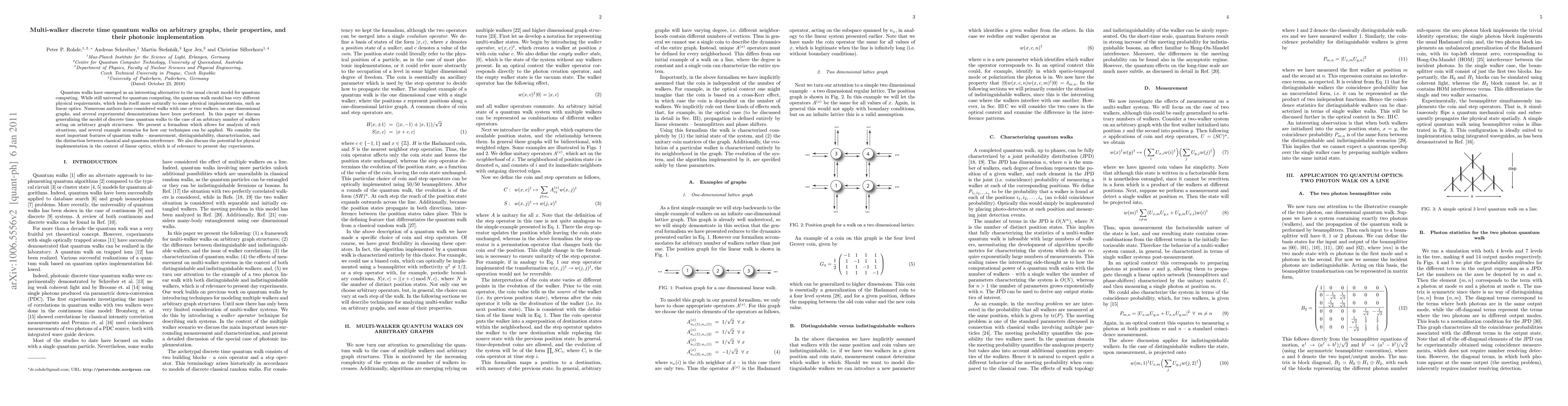 This paper generalizes the discrete time quantum walk model to multiple walkers on arbitrary graphs, analyzing their properties and discussing their potential photonic implementation via linear optics. It focuses on measurement, distinguishability, and interference characteristics, and explores their relevance to current experimental setups.