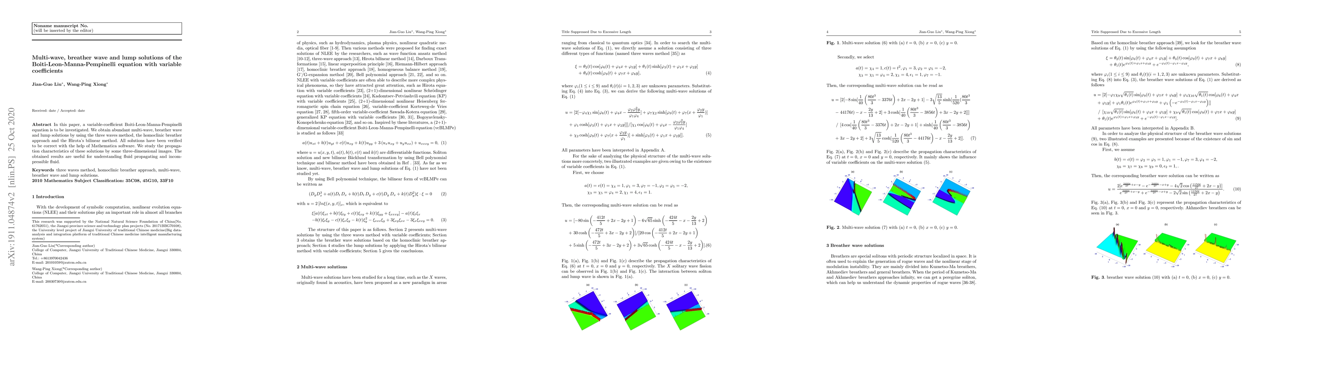 This paper investigates variable-coefficient Boiti-Leon-Manna-Pempinelli equations, deriving multi-wave, breather wave, and lump solutions using advanced mathematical methods. The solutions' validity and propagation characteristics are verified and visualized, contributing to the understanding of fluid dynamics.